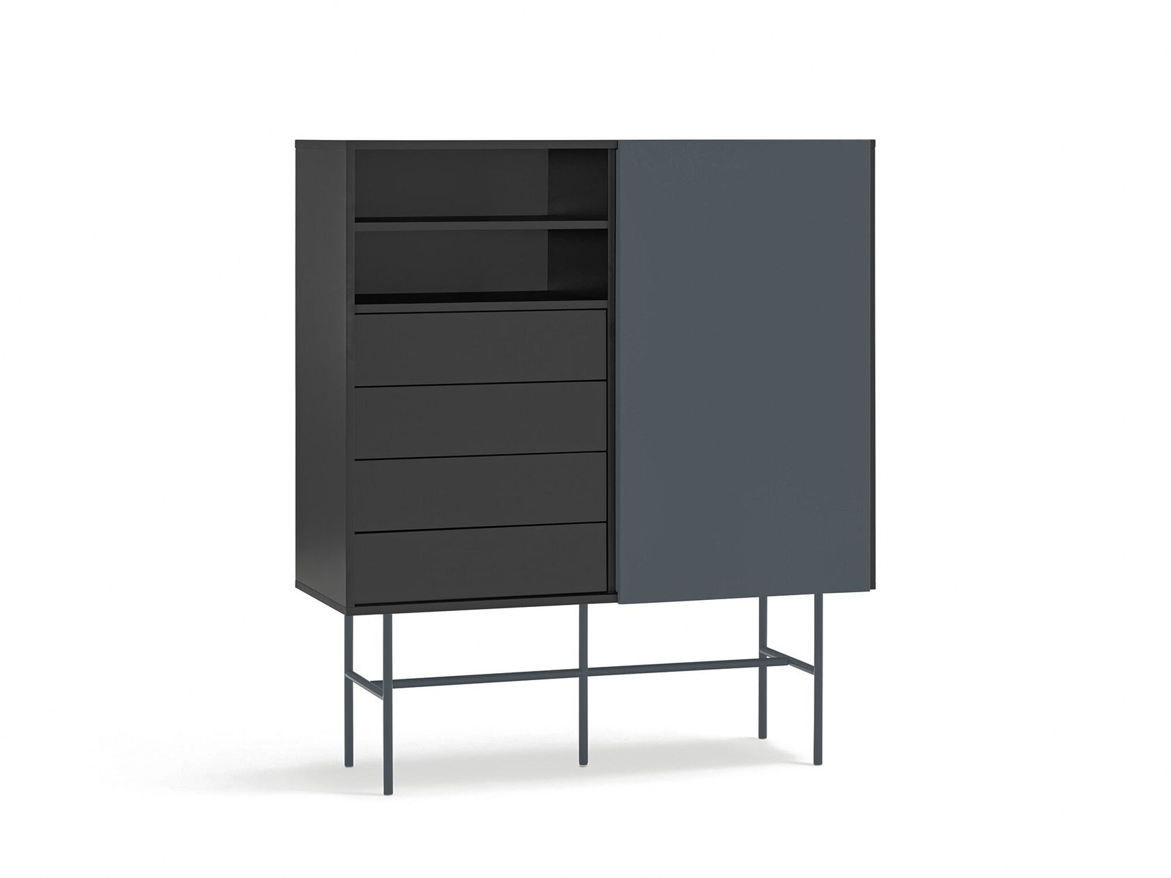 Nube es un armario de MDF lacado con una puerta corredera, cuatro cajones, compartimentos de almacenamiento y patas de acero pintado.La collection Nube se démarque par sa configuration unique et distinctive grâce à sa porte coulissante, qui permet de la placer librement selon les préférences de chacun. La forma en la que esta puerta desliza sobre la colección Nube, revelando y ocultando las distintas secciones de su interior, está inspirada en cómo las nubes se desplazan en el cielo.