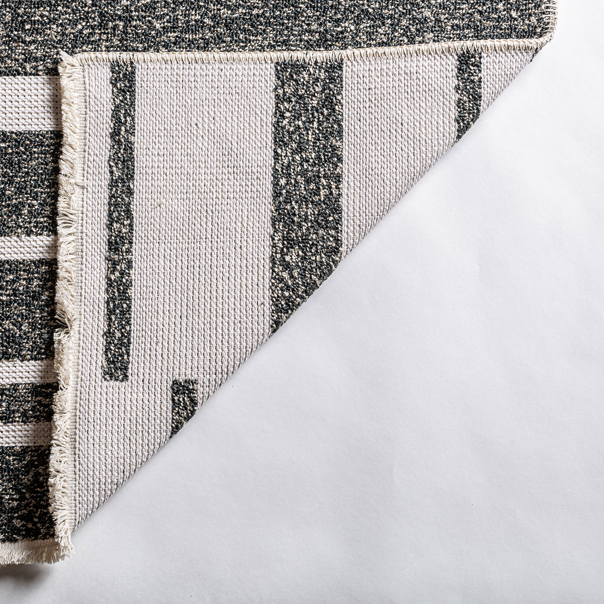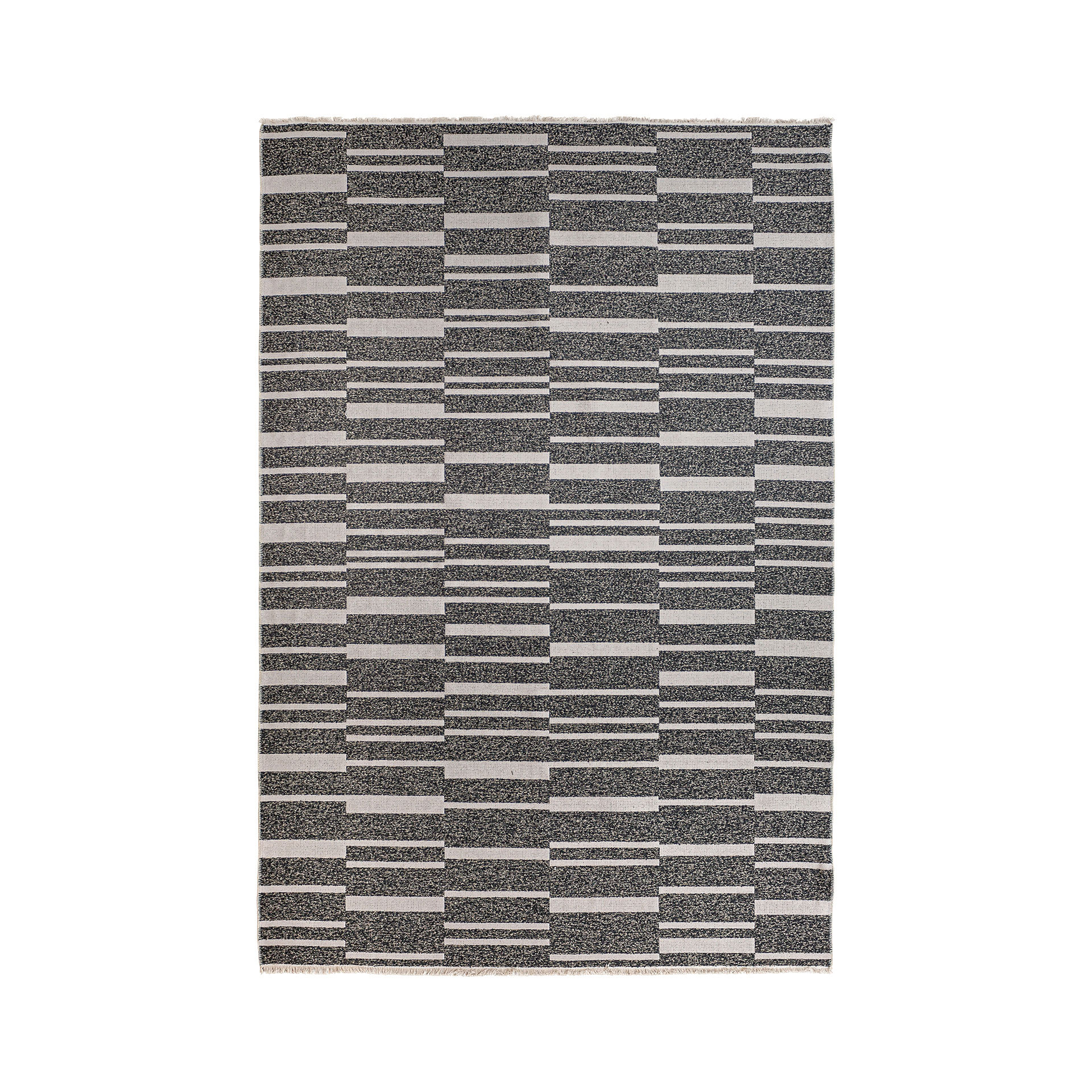 Alfombra rectangular celia de estilo contemporáneo, fabricado en poliéster en color blanco, combinado con algodón en color negro y acrílico.