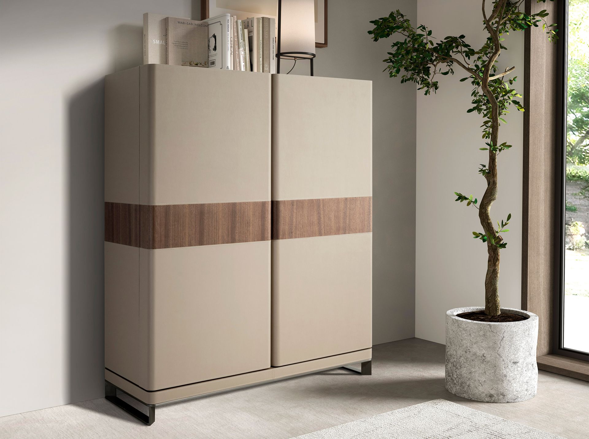 Aparador alto polipiel, nogal y acero pulido