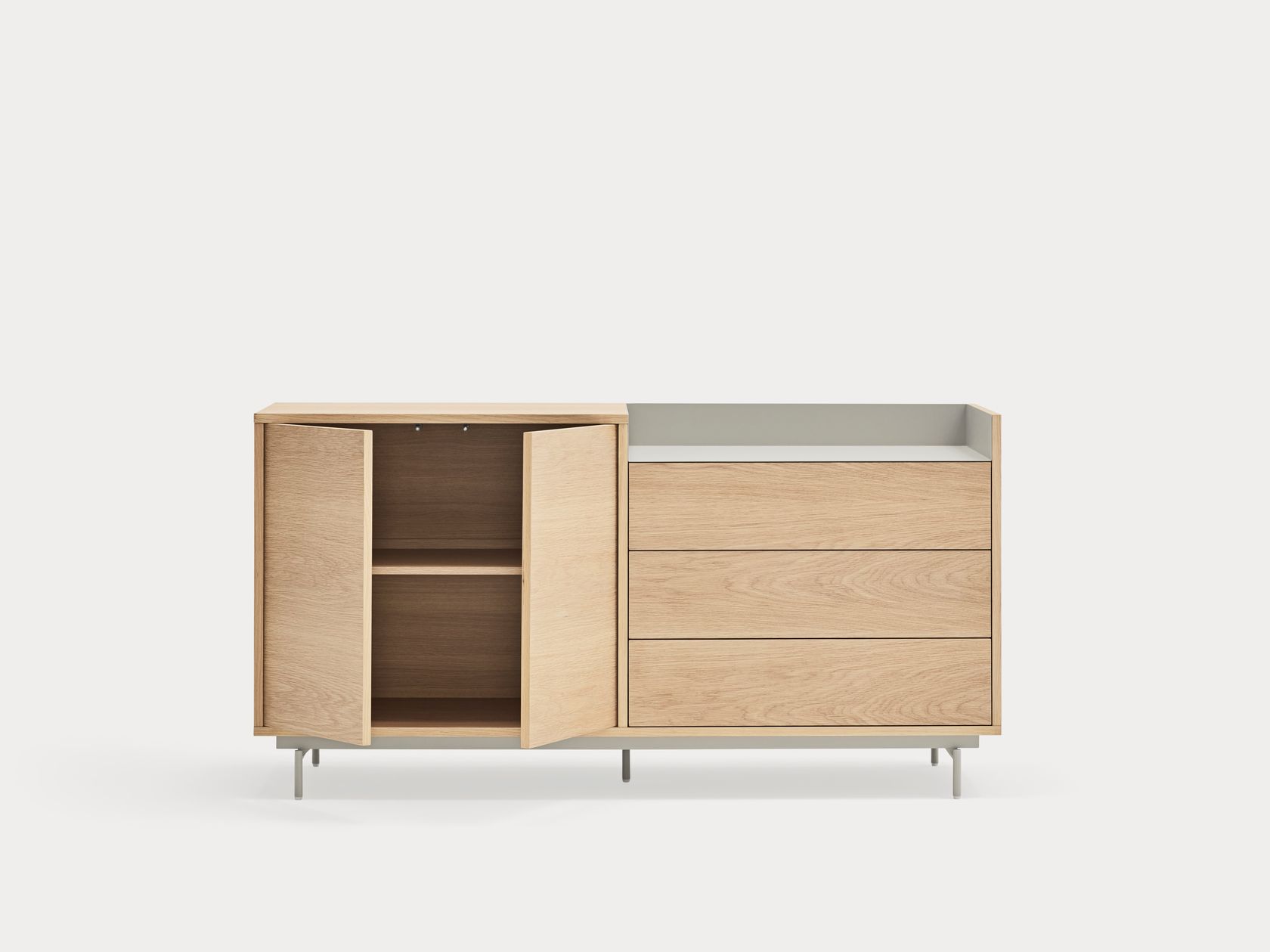 Esta construido en DM chapado en roble o nogal y dispone de varios acabados para el recubrimiento metálico para la parte superior.Valley permite al usuario disponer de espacio a dos niveles sobre los que colocar sus objetos y pertenencias. Estableciendo nuevas normas de orden para aquellos que categorizan todo o sencillamente distintas superficies donde conviven la calidez de la madera con la elegancia del metal.