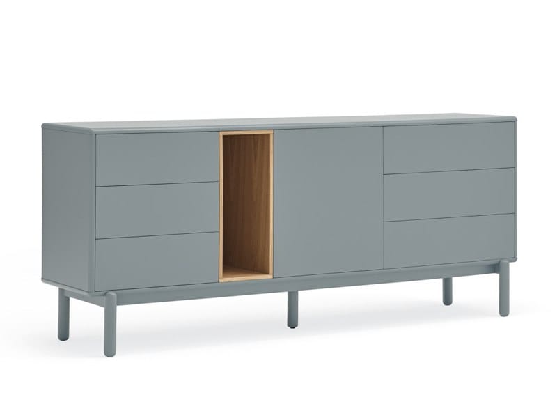 Corvo está realizado en MDF lacado a excepción del nicho, chapado en roble.La silueta redondeada del mueble, hace que Corvo sea una colección de aspecto suave y voluminoso. A su vez, esto es lo que permite que todas las piezas queden integradas de manera precisa sin necesidad de piezas extra, generando un aspecto mucho más limpio y cuidado.