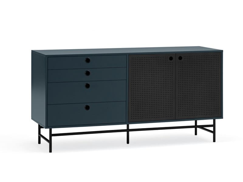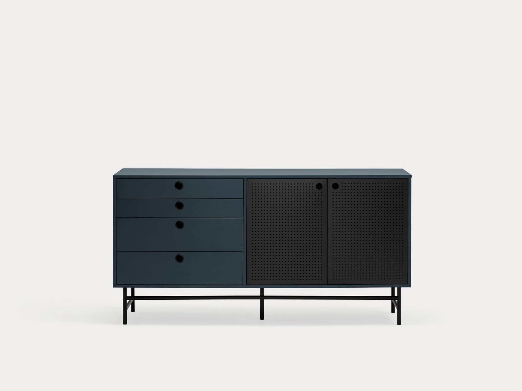 Punto presenta puertas metálicas perforadas con tirador circular integrado, seña distintiva de la colección. El casco está realizado en DM lacado en diferentes colores.De marcada inspiración industrial la colección Punto combina estos conceptos estéticos con el diseño y funcionalidad. Las puertas metálicas perforadas aportan a esta serie un carácter exclusivo y con personalidad. De líneas limpias, estas prácticas piezas rescatan la fuerza del vanguardismo industrial para adaptarse a los espacios más actuales.