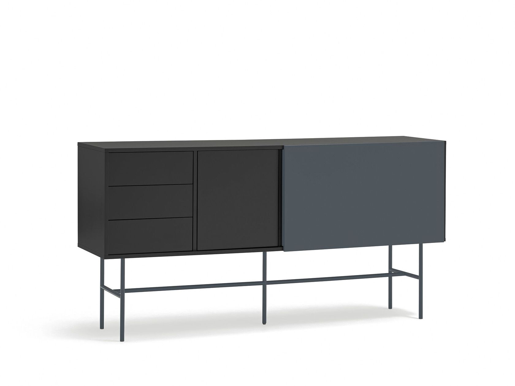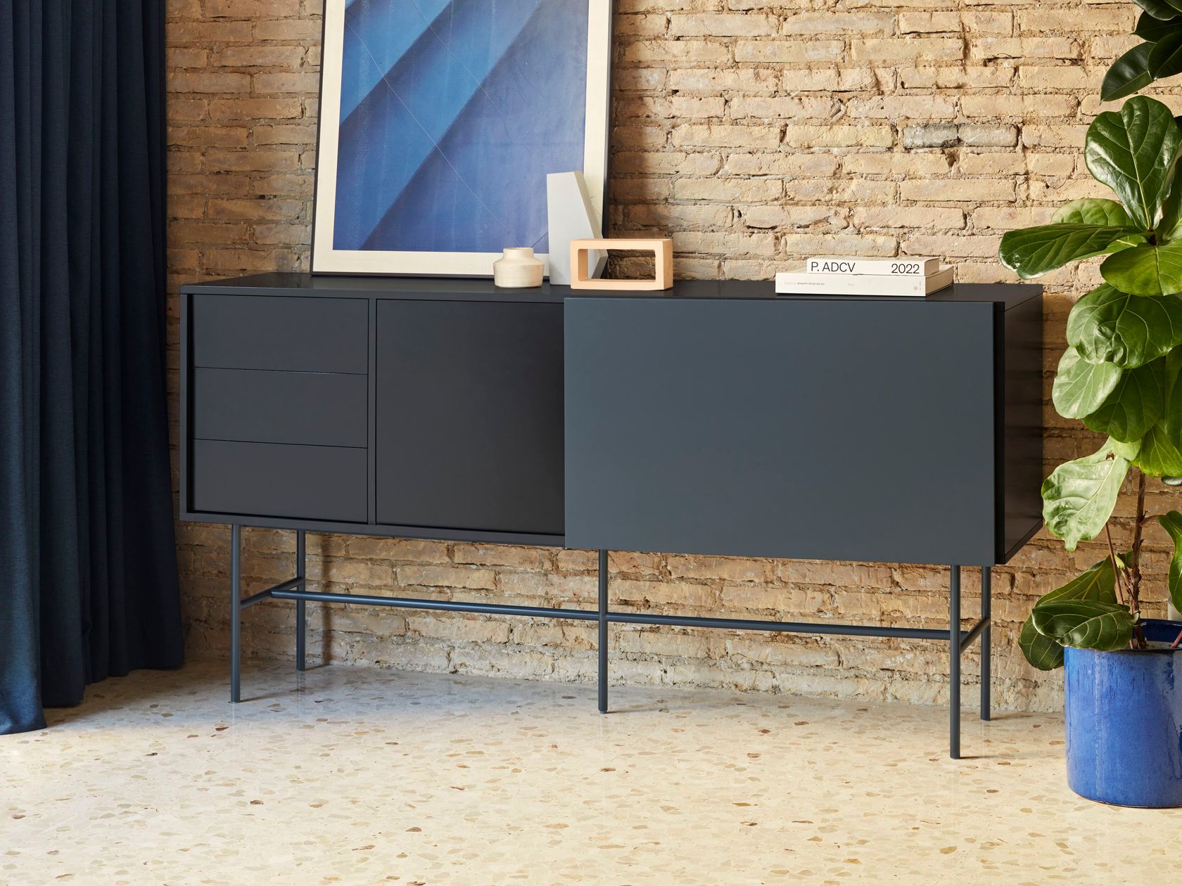 Nube es un aparador de MDF lacado con una puerta corredera y una puerta batiente, tres cajones, compartimentos de almacenamiento y patas de acero pintadoLa collection Nube se démarque par sa configuration unique et distinctive grâce à sa porte coulissante, qui permet de la placer librement selon les préférences de chacun. La forma en la que esta puerta desliza sobre la colección Nube, revelando y ocultando las distintas secciones de su interior, está inspirada en cómo las nubes se desplazan en el cielo.
