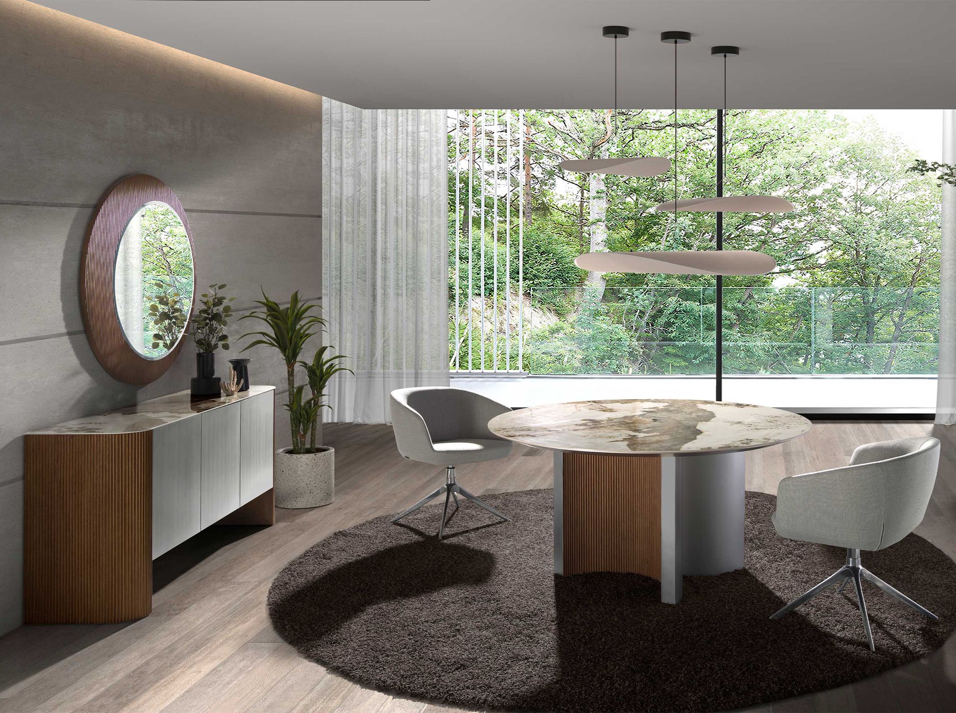 Aparador madera color plata, nogal y tapa de mármol porcelánico