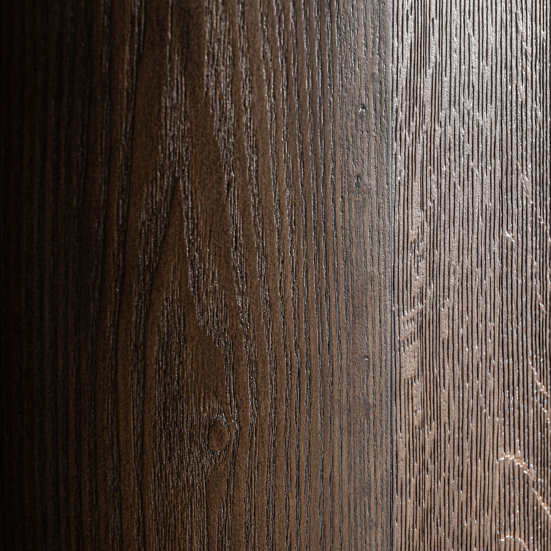 Armario Treignac de estilo art deco fabricado en chapa de roble en color marrón con acabado teñido combinado con madera dm y acero inoxidable en color oro con acabado mate. Producto desmontable.