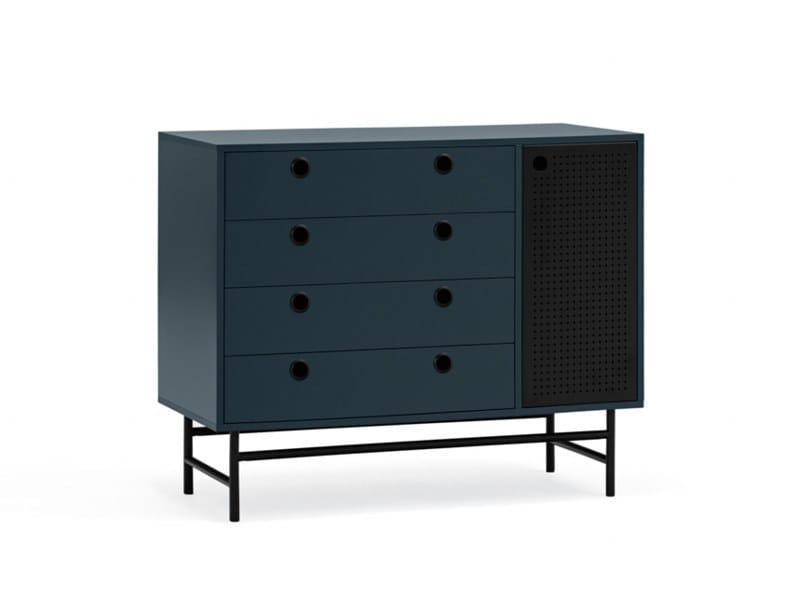 Punto presenta puertas metálicas perforadas con tirador circular integrado, seña distintiva de la colección. El casco está realizado en DM lacado en diferentes colores.De marcada inspiración industrial la colección Punto combina estos conceptos estéticos con el diseño y funcionalidad. Las puertas metálicas perforadas aportan a esta serie un carácter exclusivo y con personalidad. De líneas limpias, estas prácticas piezas rescatan la fuerza del vanguardismo industrial para adaptarse a los espacios más actuales.