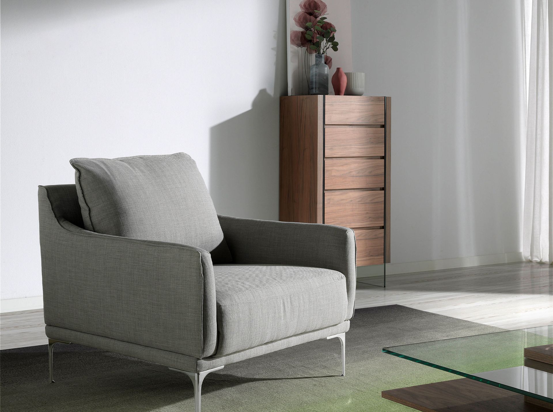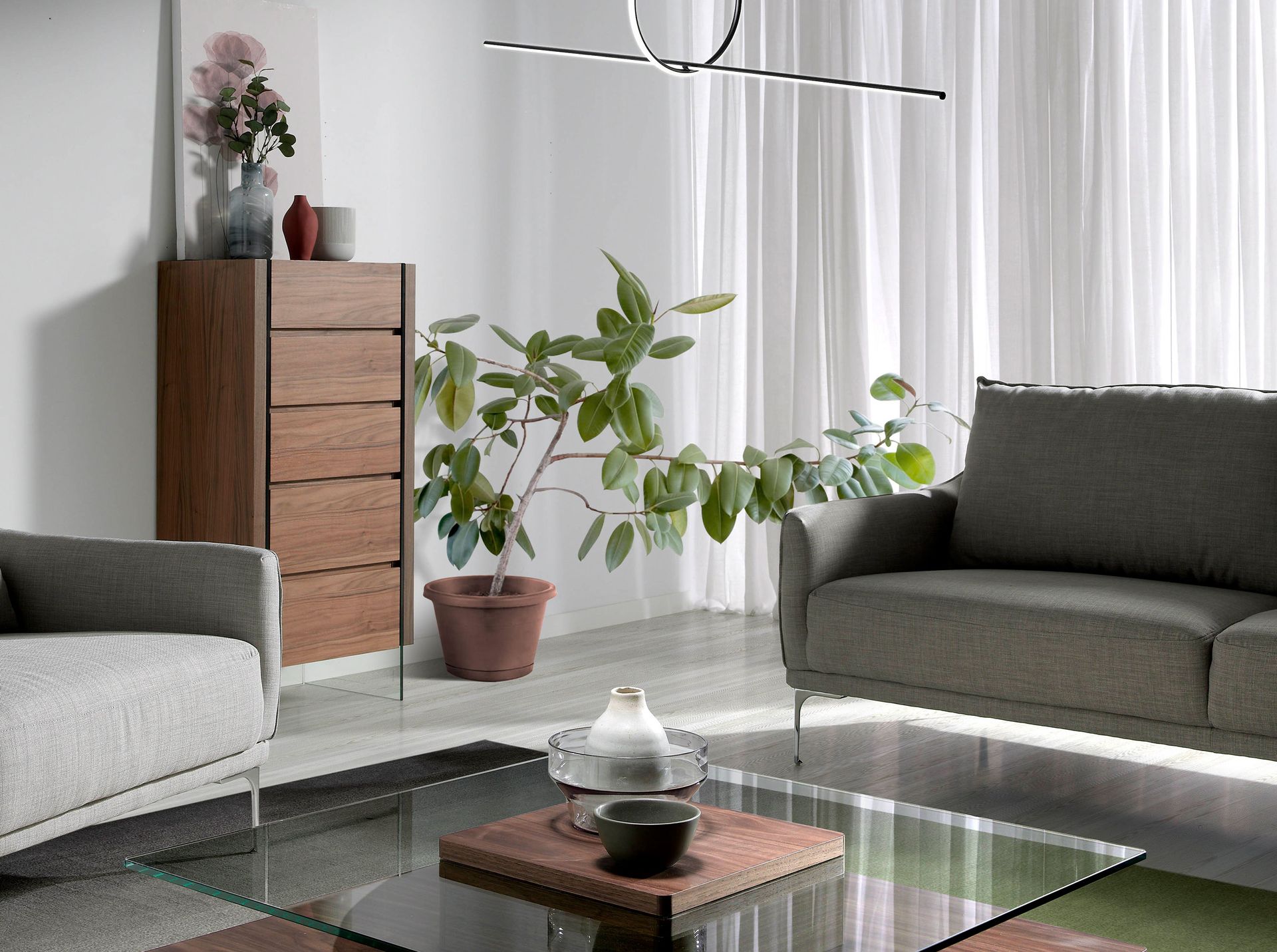 Chifonier nogal y cristal templado modelo 7041 Angel Cerdá S.L.Chifonier de diseño moderno con estructura de madera chapada en nogal natural y unas originales patas de cristal templado. Cuenta con un amplio espacio de almacenaje con 5 cajones con sistema de apertura uñero y cierre soft-closing. Medidas del producto: 58 x 39 x 119 cm.- Un chifonier elegante y sofisticado de madera chapada en nogal natural de 0,5 mm de espesor con el que conseguirá el toque de modernidad y calidez que busca para su dormitorio. – El acabado de sus patas en cristal templado creará una mayor sensación de luminosidad, a la vez que de mayor calidez. – Versátil y funcional, su diseño permite que encaje en cualquier ambiente, convirtiéndose en un elemento clave de la decoración de su hogar. – Práctico y funcional, gracias a su espacio de almacenaje podrá mantener todo en su sitio, eliminando ruido visual en su dormitorio.