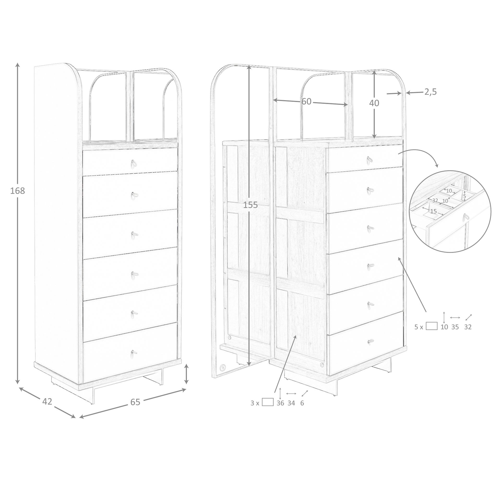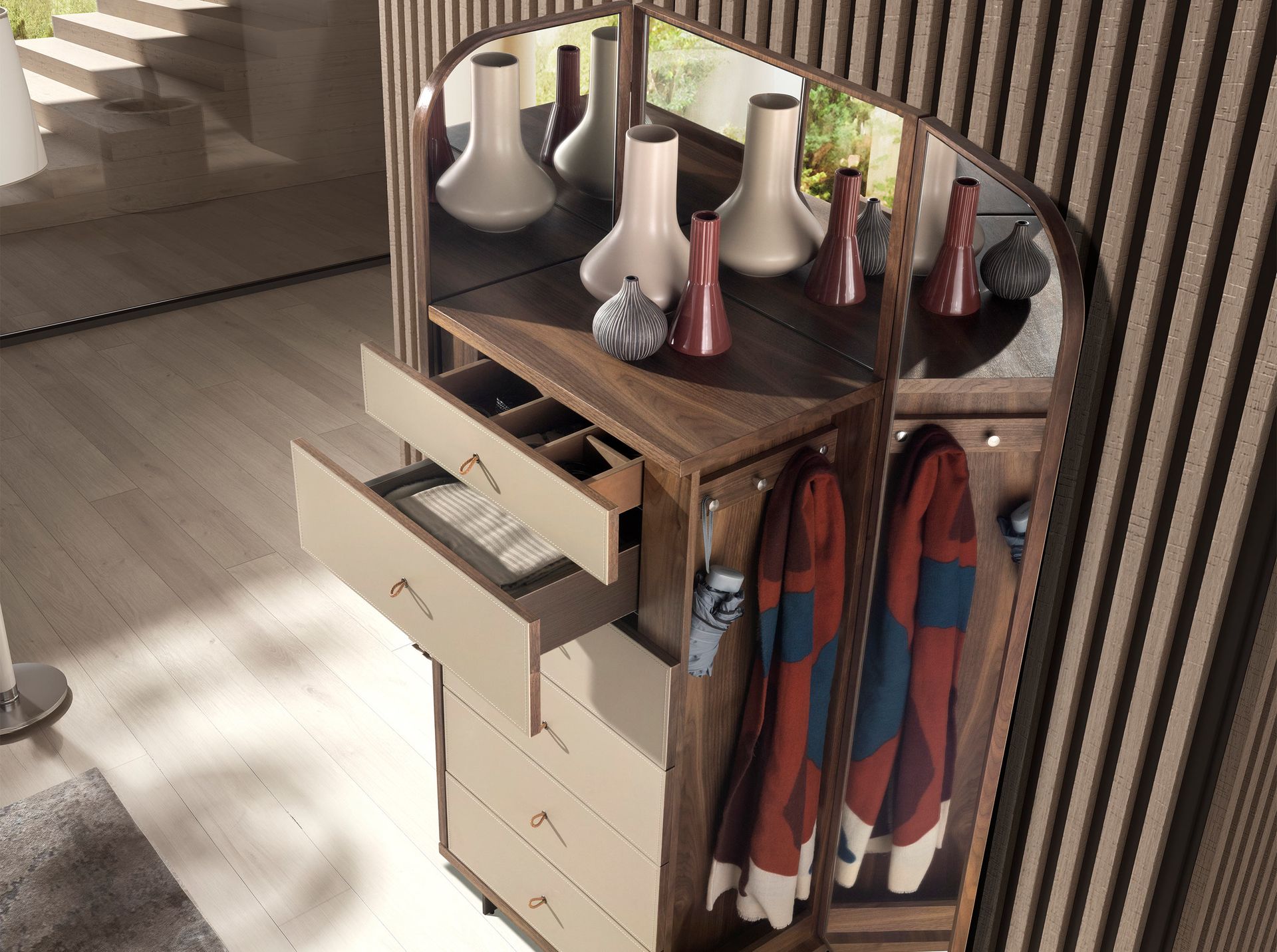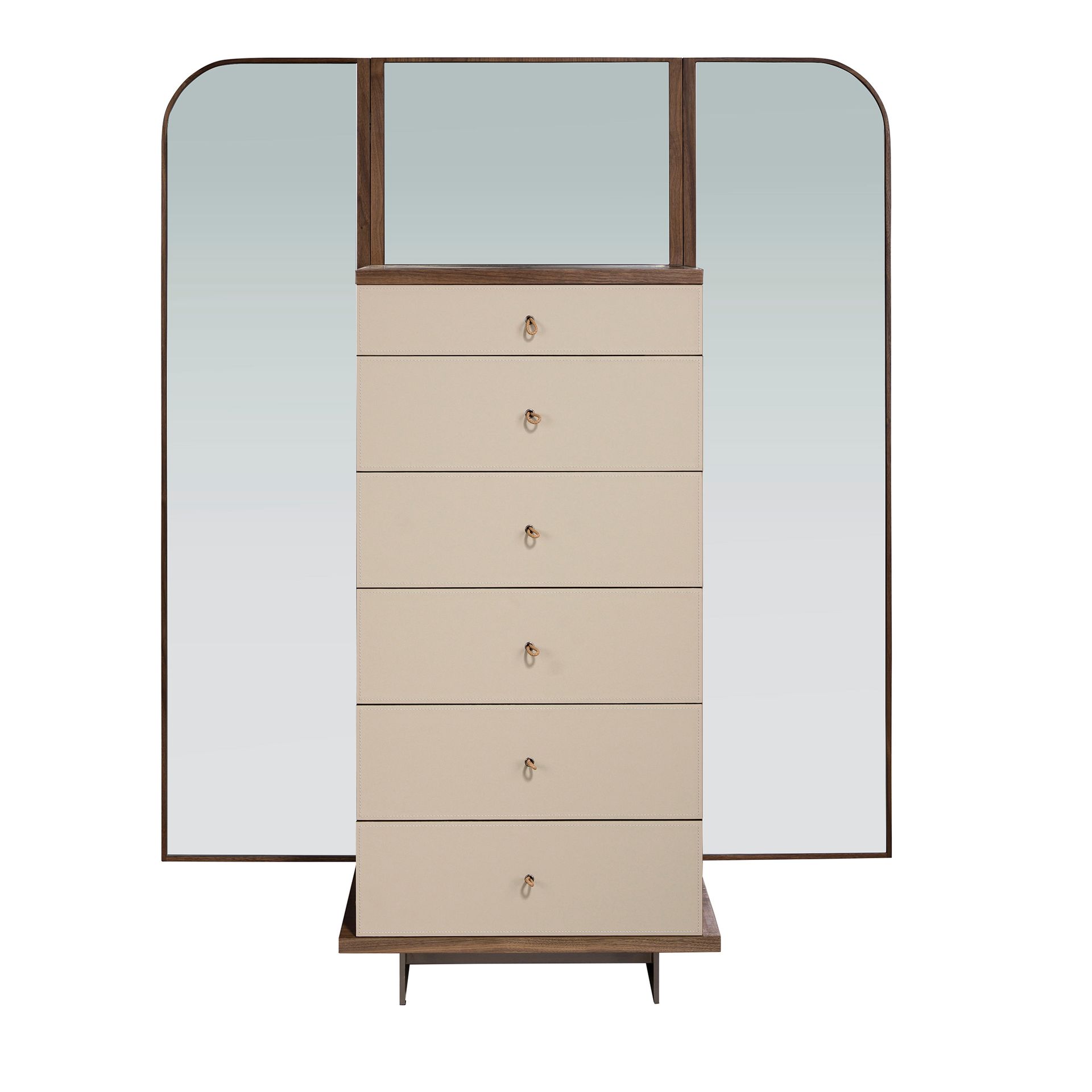 Chifonier polipiel, nogal y acero pulido con espejo modelo 7206 Angel Cerdá S.L.Chifonier de diseño moderno con estructura de madera chapada en nogal natural tapizada en polipiel color visón y unas originales patas de acero inoxidable pulido. Cuenta con un amplio espacio de almacenaje con 6 cajones con sistema de apertura tirador de lengüeta y cierre soft-closing. Medidas del producto: 65 x 42 x 168 cm.- Este elegante mueble de madera chapada en nogal natural de 0,5 mm de espesor, aportará el toque diferente y moderno que busca para su hogar. – El acero de sus patas, así como su diseño lineal, permite que encaje en cualquier espacio de su hogar. – El textil de este original chifonier está tapizado en polipiel color visón, aportando el toque diferente y moderno que busca en su hogar. – Práctico y funcional, gracias a su espacio de almacenaje podrá mantener todo en su sitio, eliminando ruido visual en su dormitorio. – Elegancia y funcionalidad se unen en este chifonier equipado con un práctico espejo de tres paneles que facilita el arreglo personal y aporta luminosidad al ambiente. Sus cajones incluyen compartimentos específicos para joyas y accesorios, ofreciendo máxima organización y protección. Además, incorpora perchero y secciones laterales extras para una organización completa.