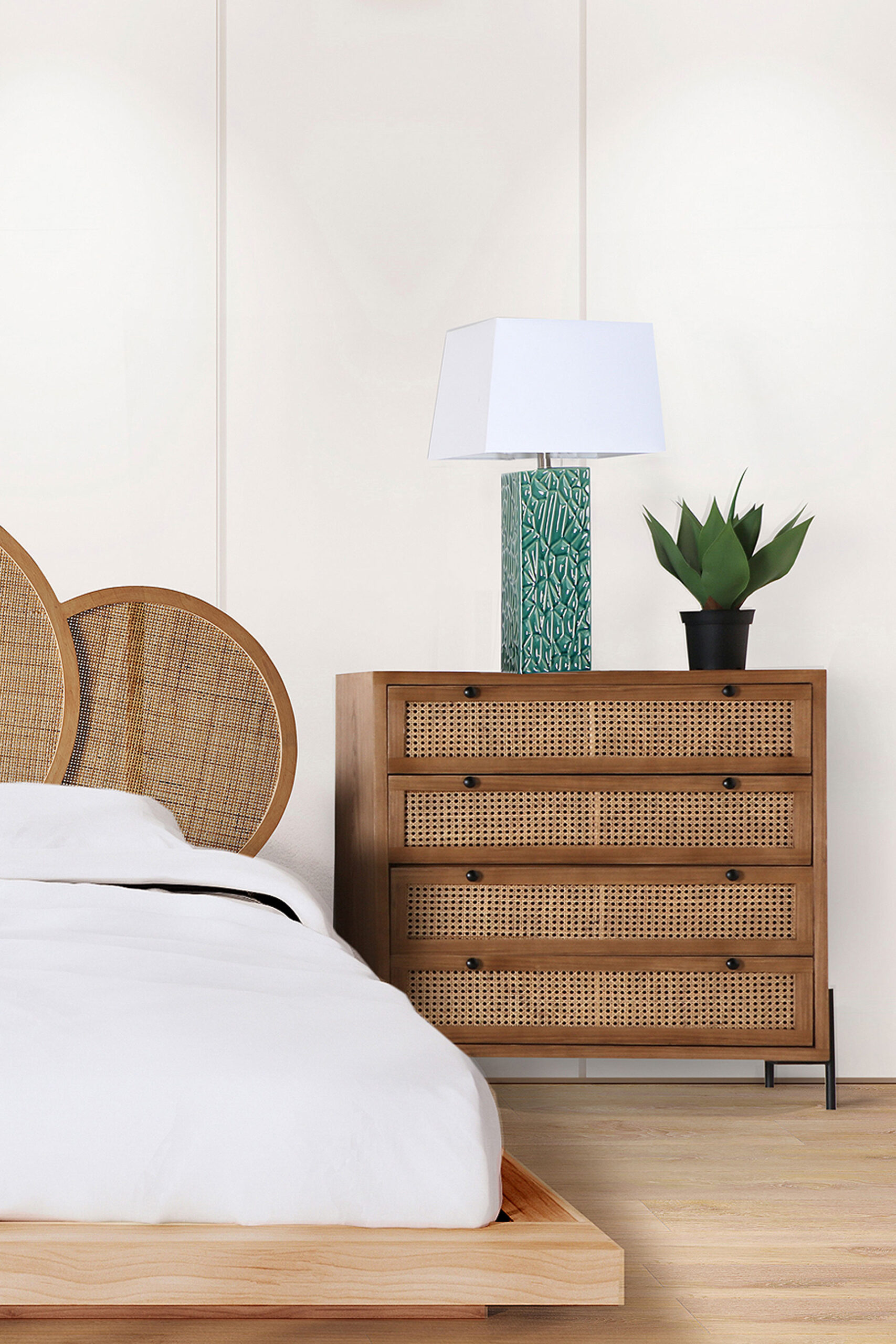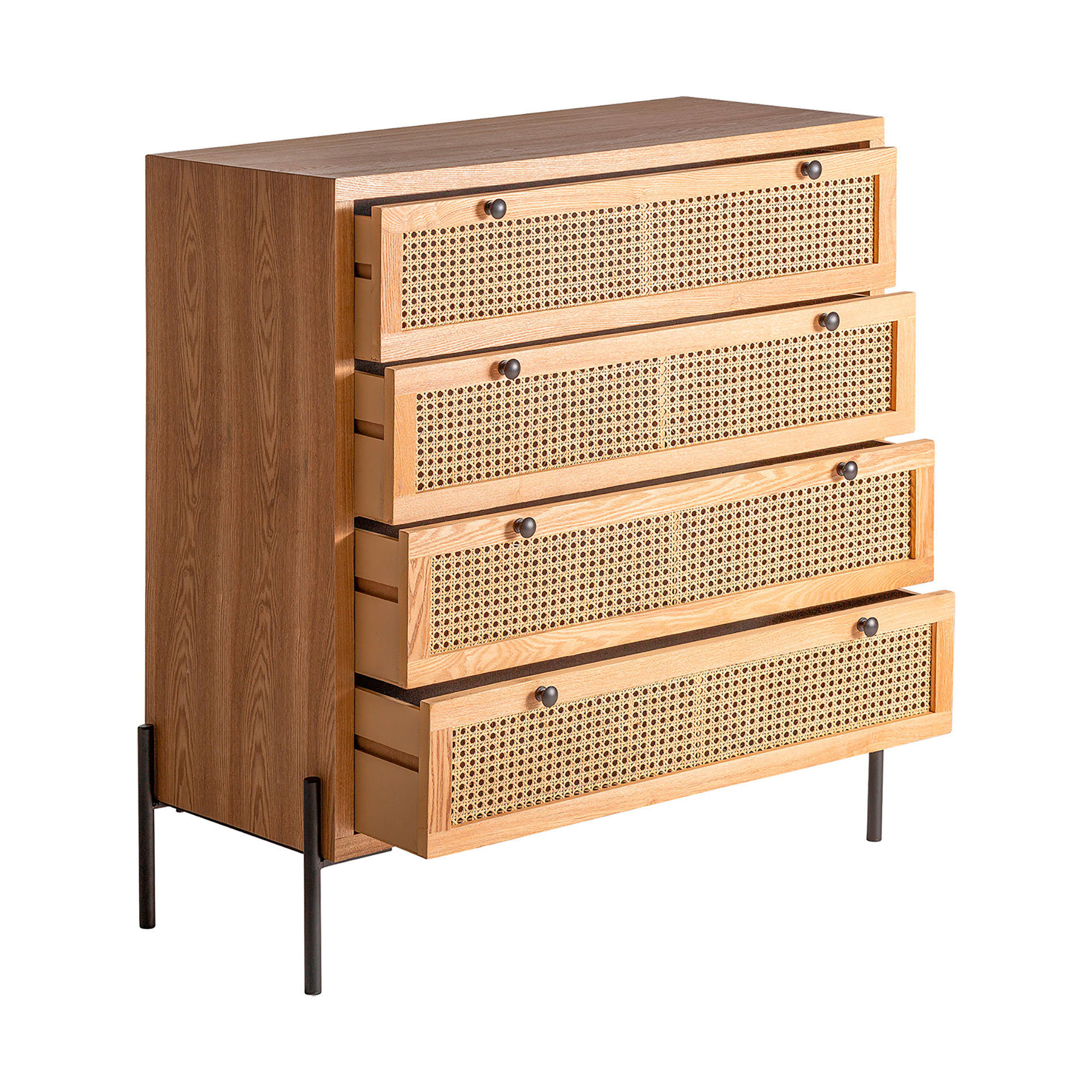 Cómoda rectangular zetel de estilo contemporáneo, fabricado en madera dm en color marrón, combinado con ratán en color marrón claro y hierro en color negro. Producto desmontable.