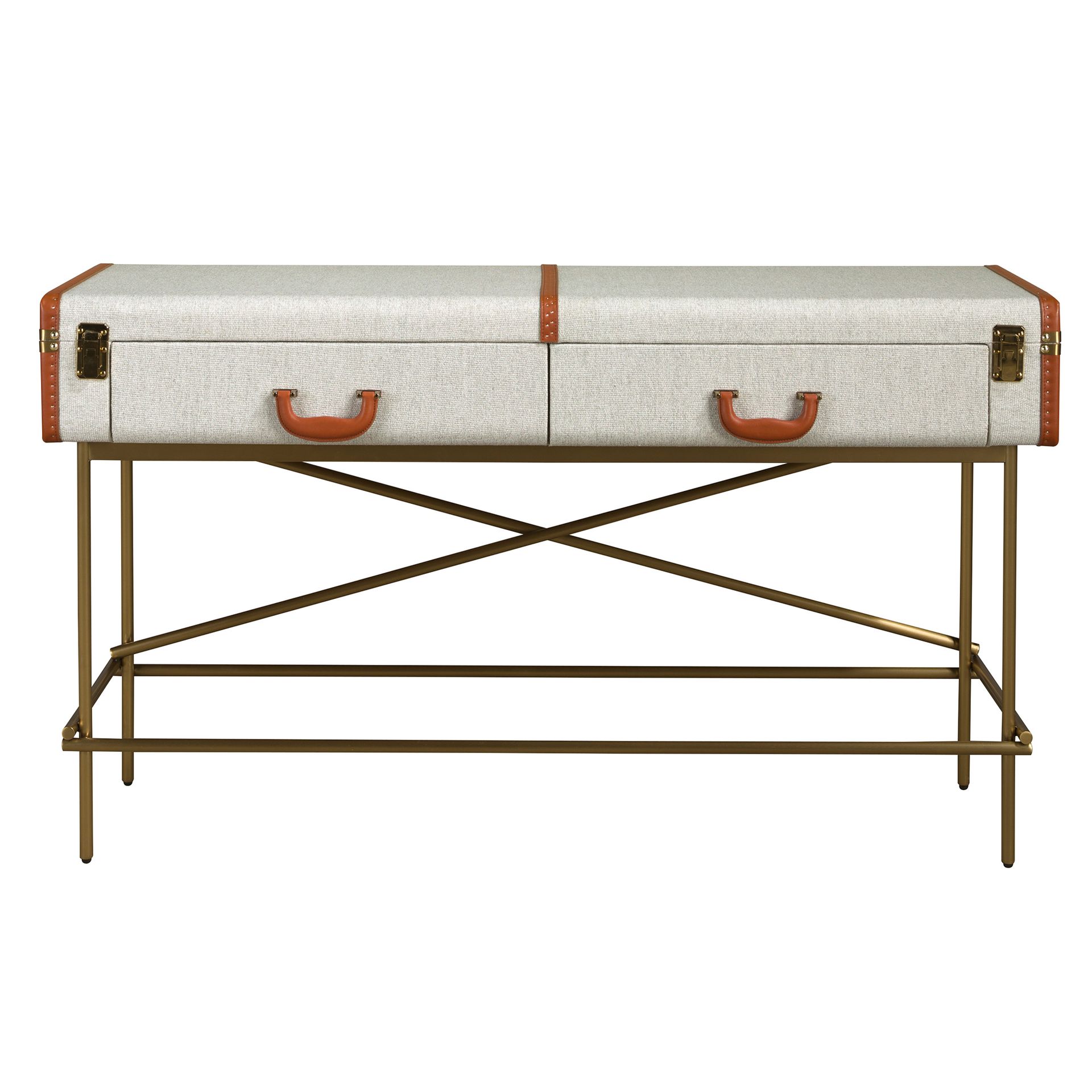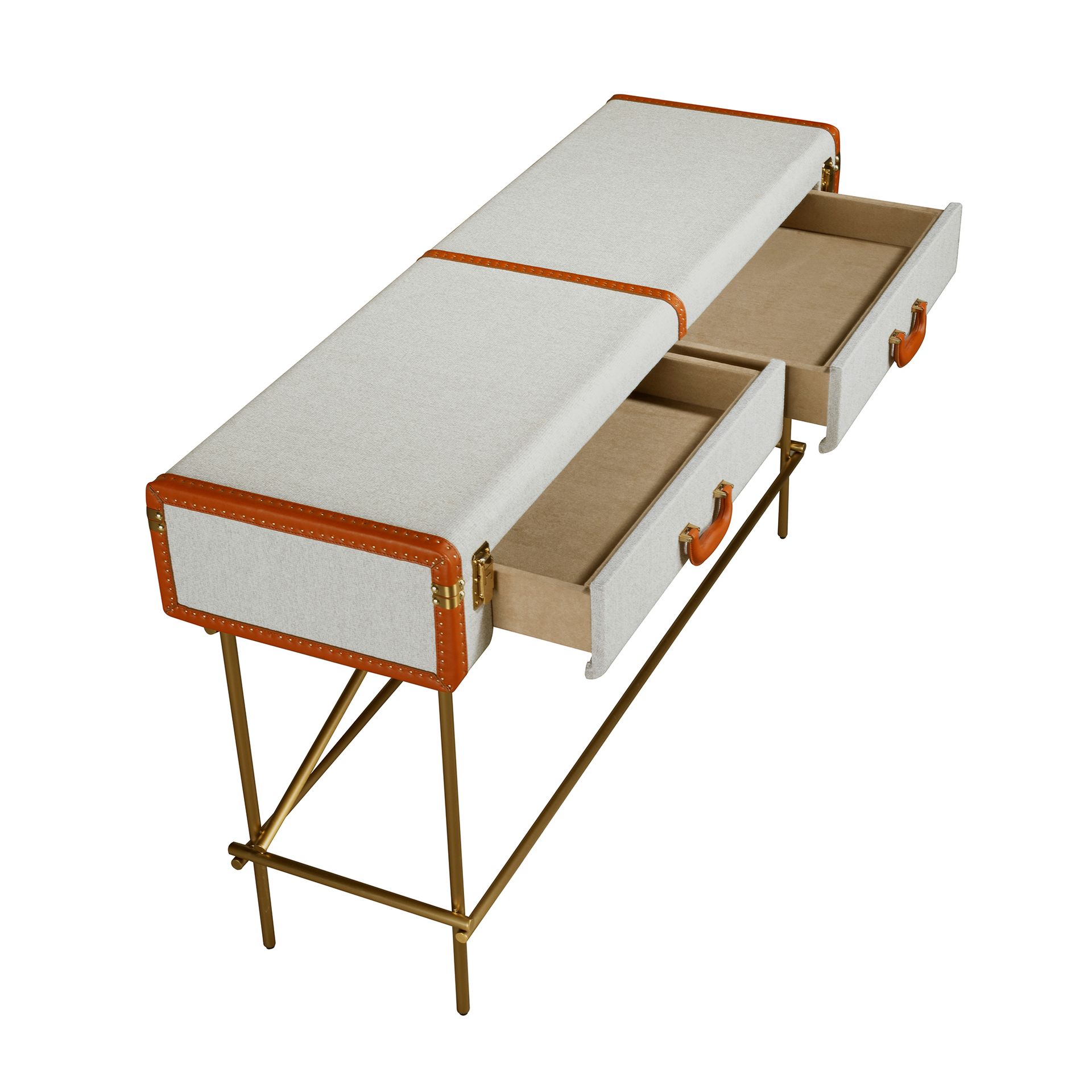 Consola rectangular tela, nogal y acero pulido dorado | – Material de la estructura: Madera chapada en nogal natural de 0,5 mm de espesor- Material de las patas: Acero inoxidable pulido en color dorado- Material del detalle: Piel de origen vacuno de 1.25 mm de espesor- Material del interior de los cajones: Tela aterciopelada