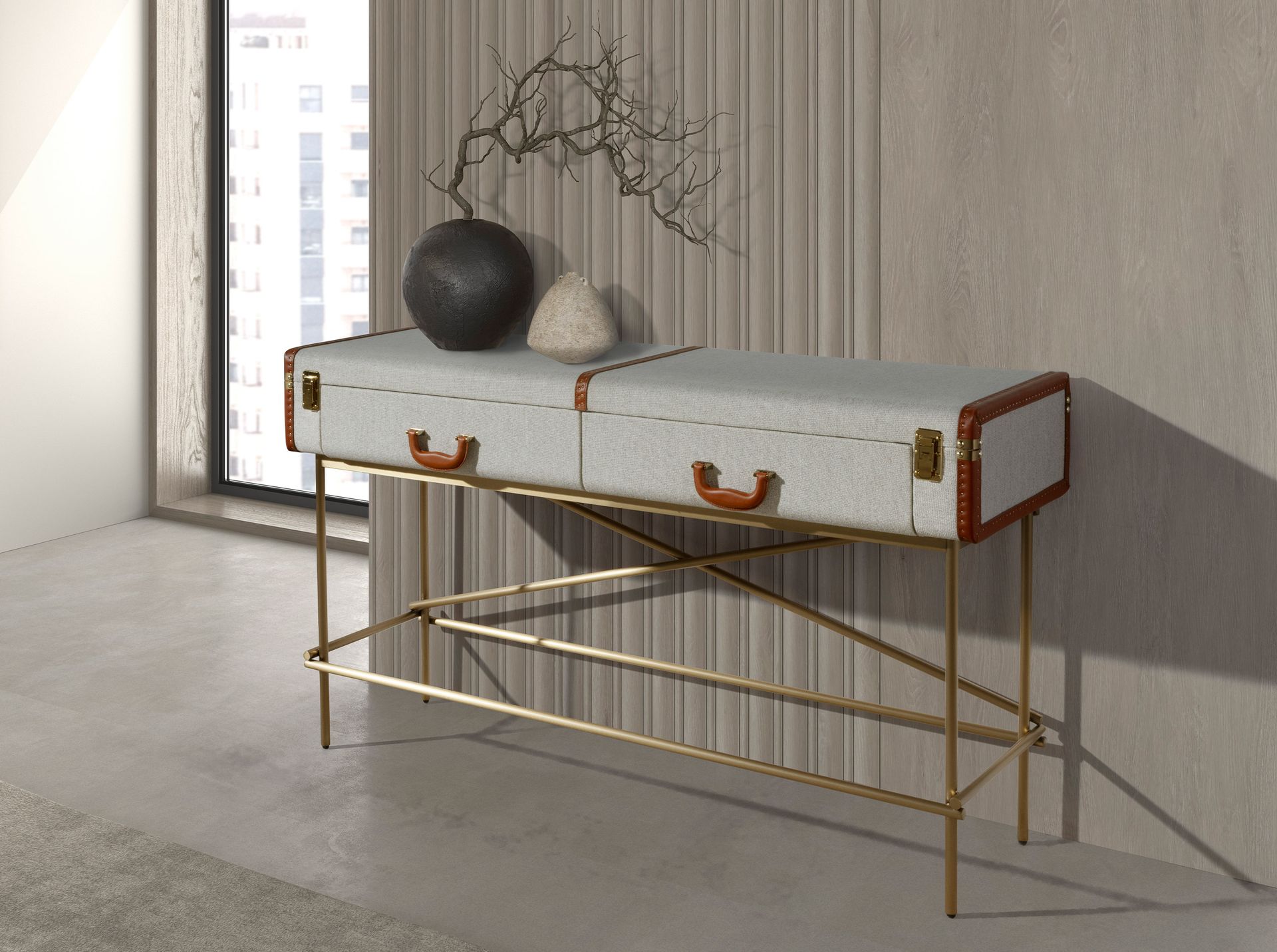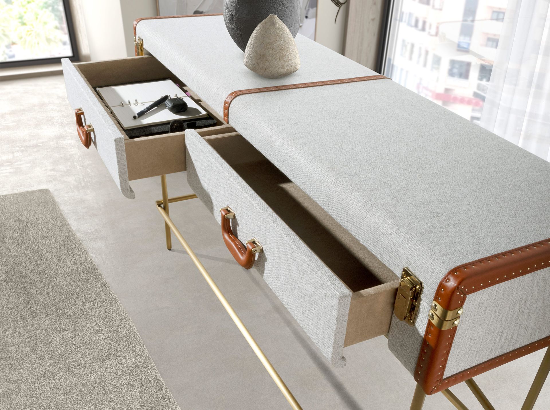 Consola rectangular tela, nogal y acero pulido dorado modelo 3271 Angel Cerdá S.L.Consola rectangular de diseño moderno fabricada en madera chapada en nogal natural combinada con un elegante tapizado en tela color gris claro. Su estructura de patas de acero inoxidable pulido en color dorado, aporta el toque de modernidad y vanguardia que busca para su hogar. Su original detalle en piel de origen vacuno aporta el toque de estilo ideal para tu salón. Cuenta con un amplio espacio de almacenaje con 2 cajones con sistema de apertura tirador de lengüeta y cierre soft-closing. Medidas del producto: 141 x 45 x 81 cm.- El textil de esta original consola tapizada en tela gris, aportará el toque diferente y moderno que busca para su hogar. – Este original recibidor queda apoyado sobre una base de acero inoxidable pulido en color dorado que le confiere una mayor estabilidad, así como un diseño único y exclusivo. – Versátil y funcional, su diseño permite que encaje en cualquier ambiente, convirtiéndose en un elemento clave de la decoración de su hogar. – Gracias a sus 2 cajones, cuenta con espacio de almacenaje para poder guardar todo lo que necesite tener a mano para su día a día, manteniendo así el orden visual en la habitación. – Los originales tiradores en acabado piel color marrón le confieren un toque de carácter y personalidad.