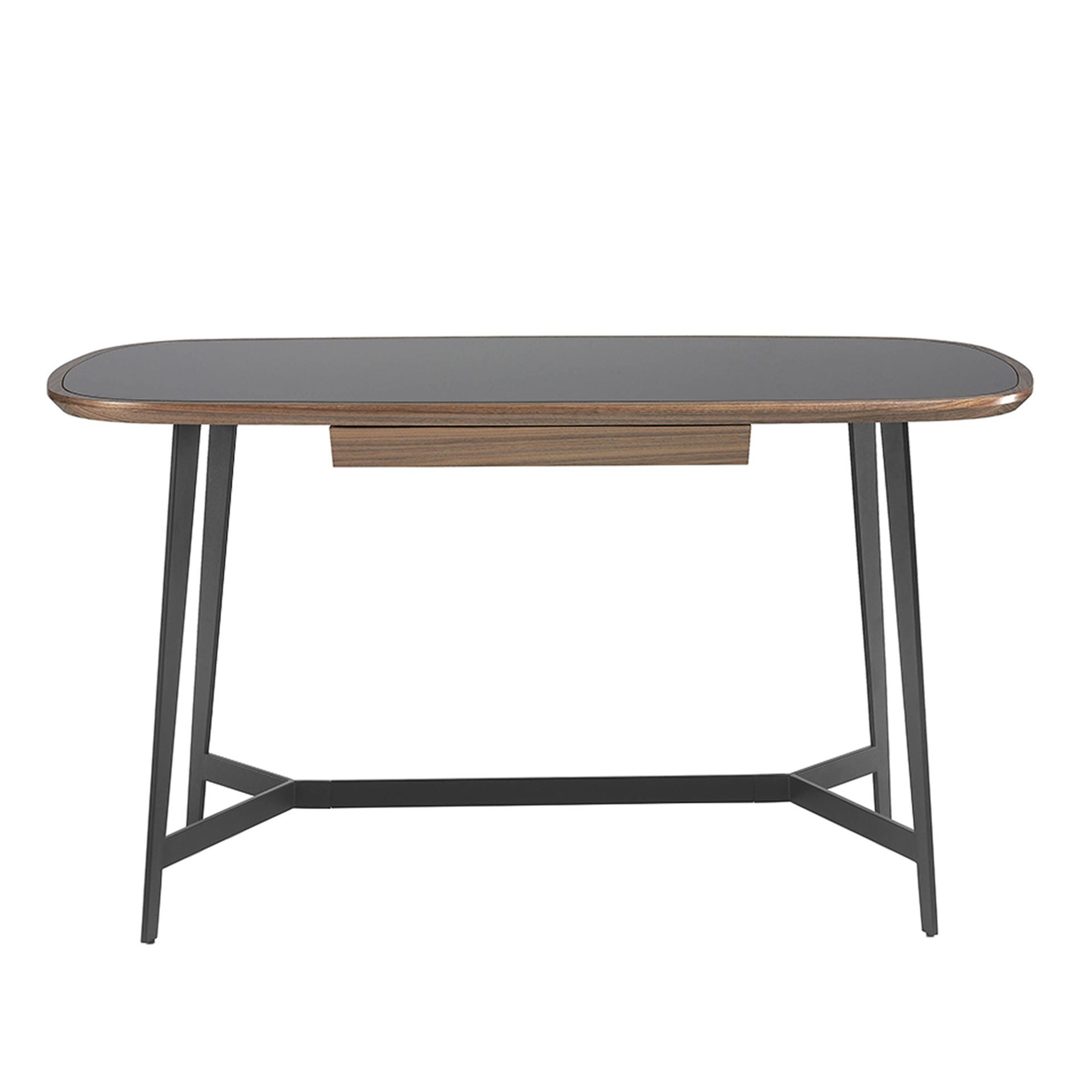 Escritorio nogal y acero negro con tapa de cristal negro