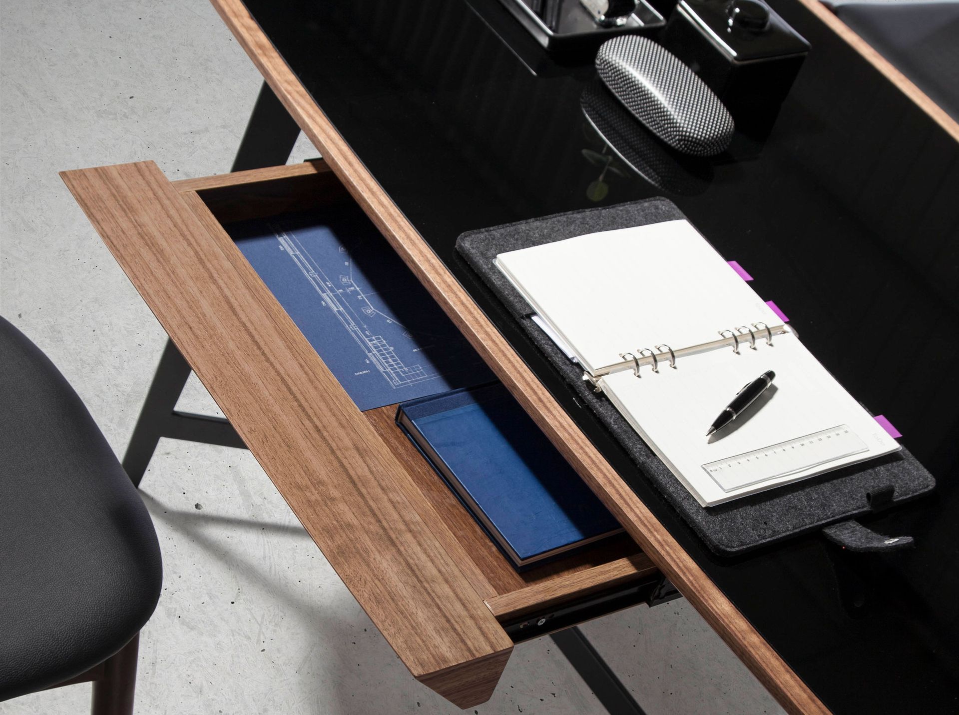 Escritorio nogal y acero negro con tapa de cristal negro | – Material de la tapa: Cristal templado de 12mm de espesor tintado en color negro- Material de la estructura: Madera chapada en nogal natural de 0,5 mm de espesor- Material de las patas: Acero inoxidable pintado en epoxi negro- Material del interior de los cajones: Madera chapada en nogal natural de 0,5 mm de espesor