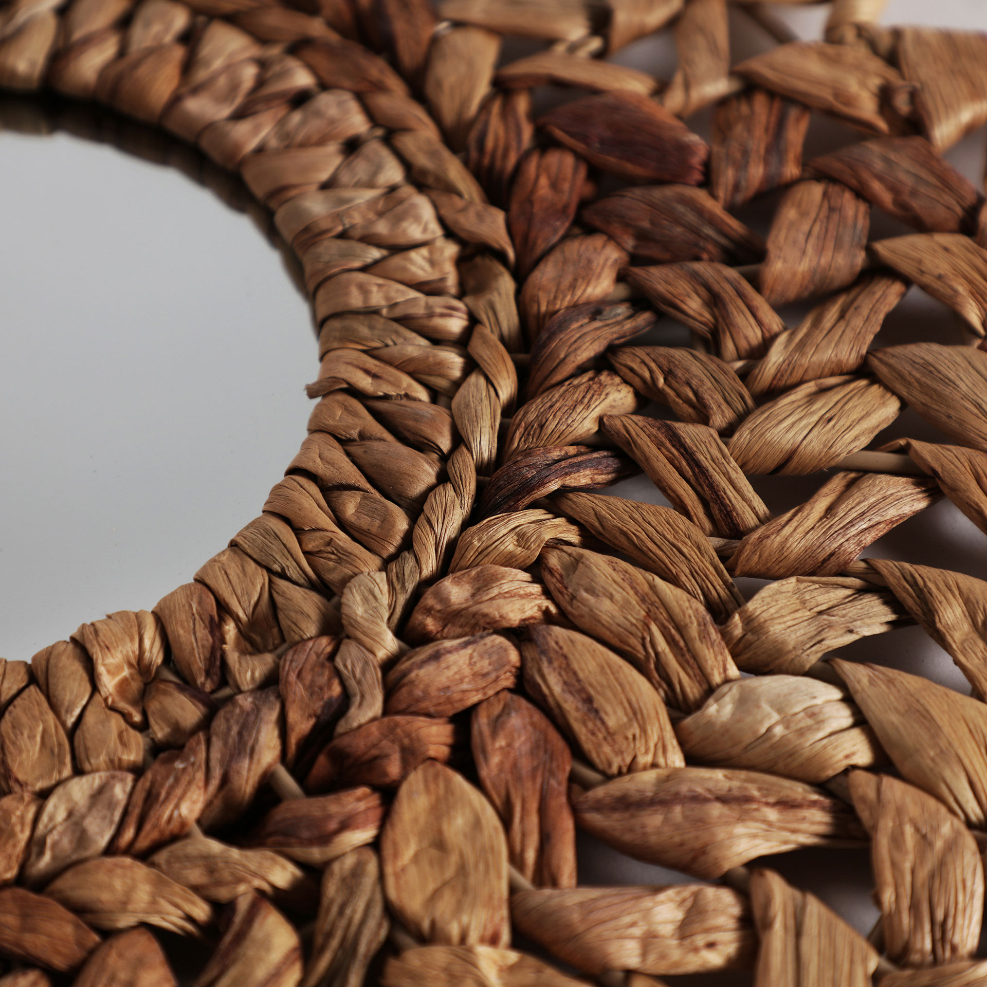 Espejo irregular blair de estilo boho, fabricado en paja en color marrón, combinado con espejo y hierro.