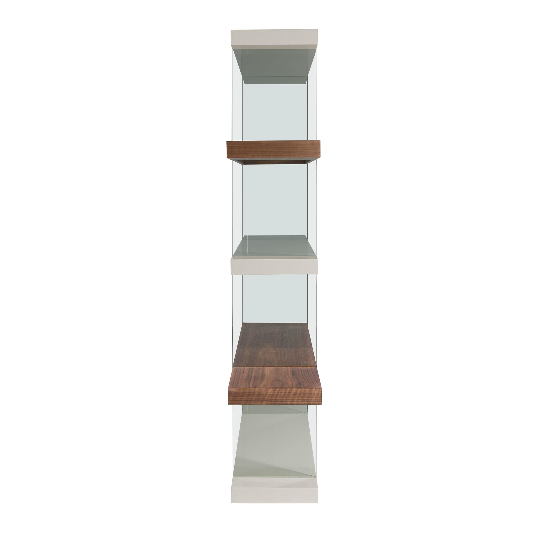 Estantería madera nogal y cristal | – Material de las baldas: Madera chapada en nogal natural de 0,5 mm de espesor y madera MDF lacada color gris. – Material de la estructura: Cristal templado.