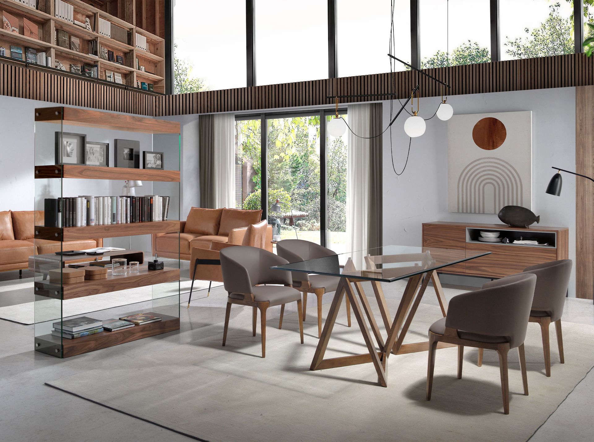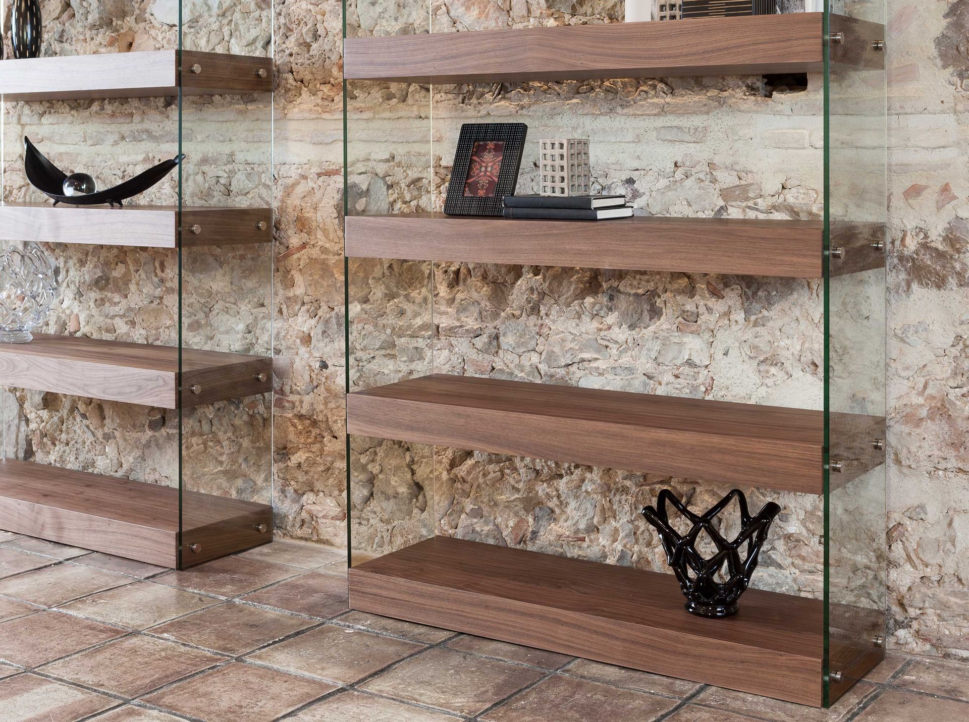 Estantería nogal y cristal | – Material de las baldas: Madera chapada en nogal natural de 0,5 mm de espesor. – Material de la estructura: Cristal templado.