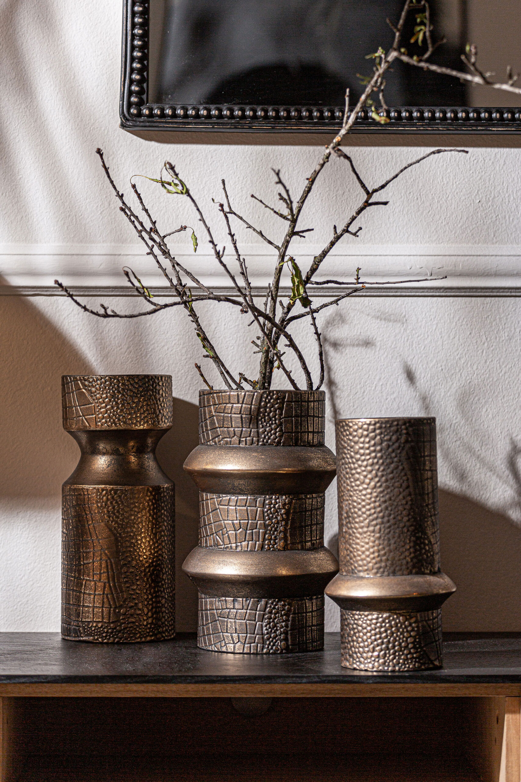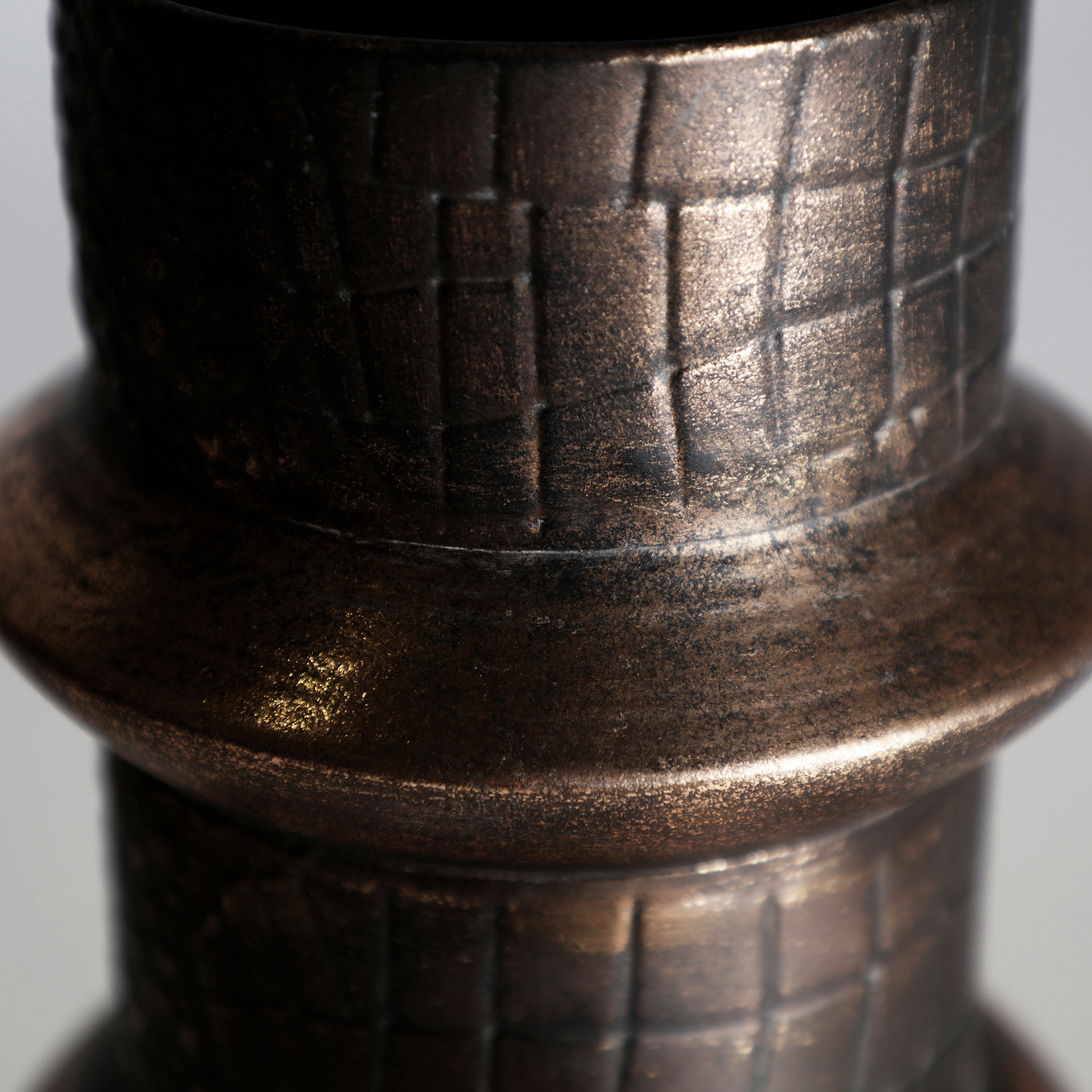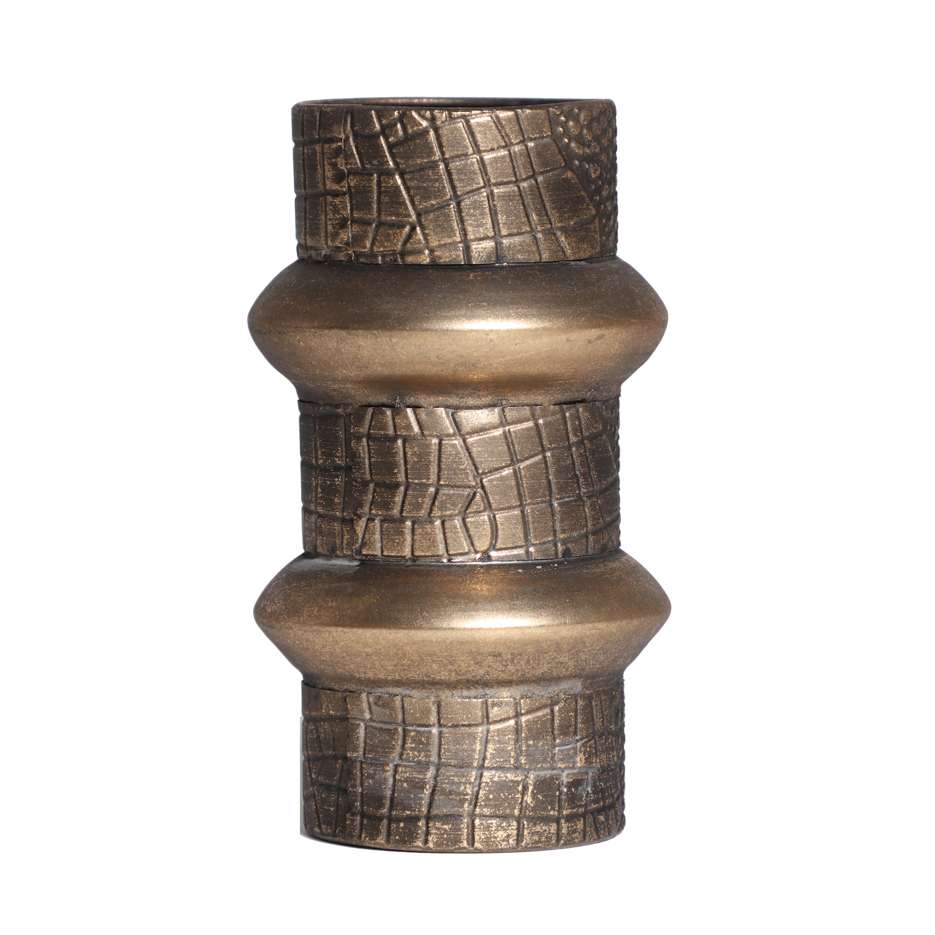 Jarrón redondo vesc de estilo art deco, fabricado en hierro en color oro con acabado antic.