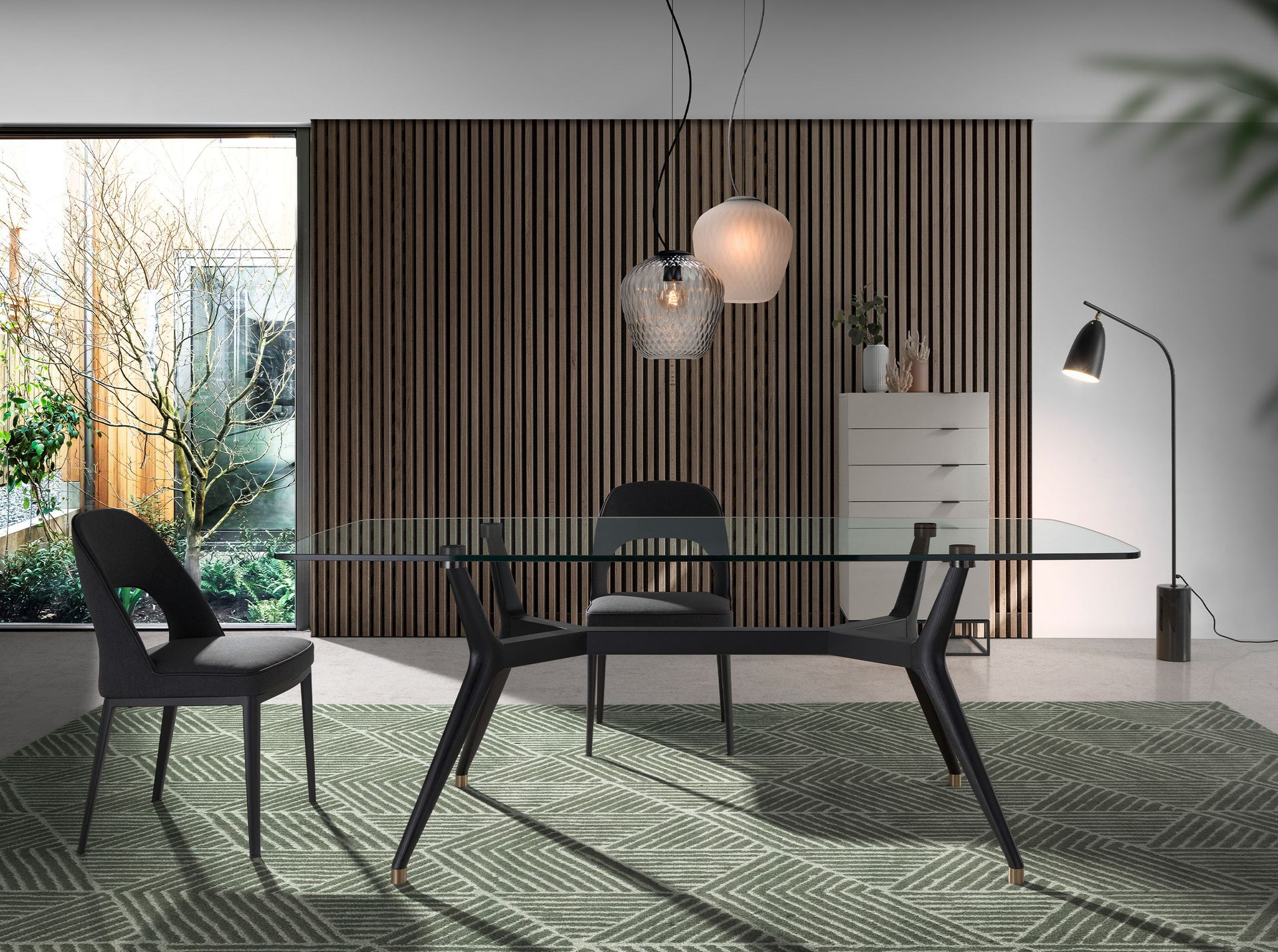 Lámpara de pie mármol negro y acero negro | – Material de la pantalla: Acero inoxidable color negro- Material de la estructura: Acero inoxidable color negro- Material de la base: Mármol porcelánico color negro con vetas grises en acabado brillo