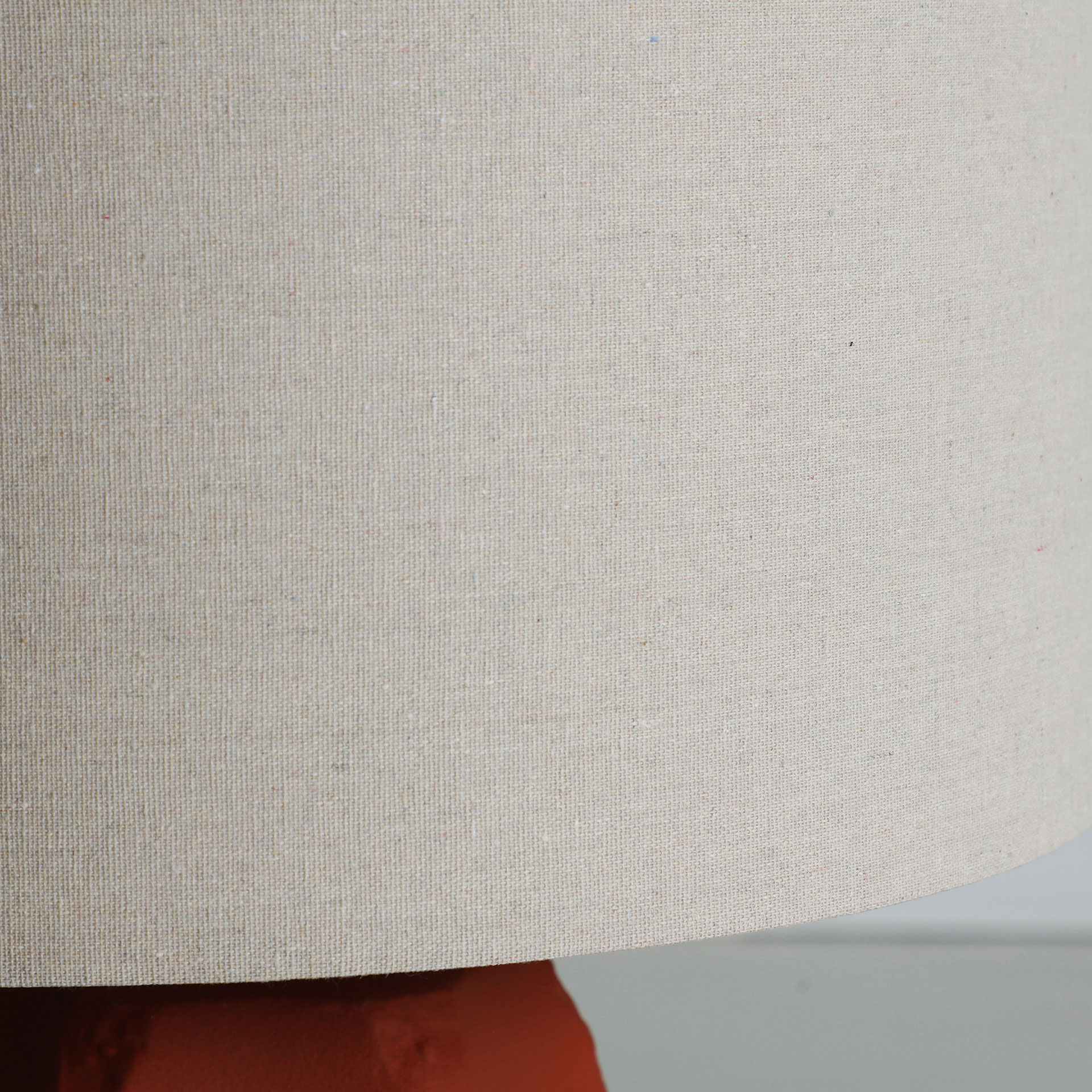 Lámpara de sobremesa Argila de estilo contemporáneo, fabricado en cerámica en color terracota, combinado con acero en color dorado y lino en color blanco roto. Producto desmontable.