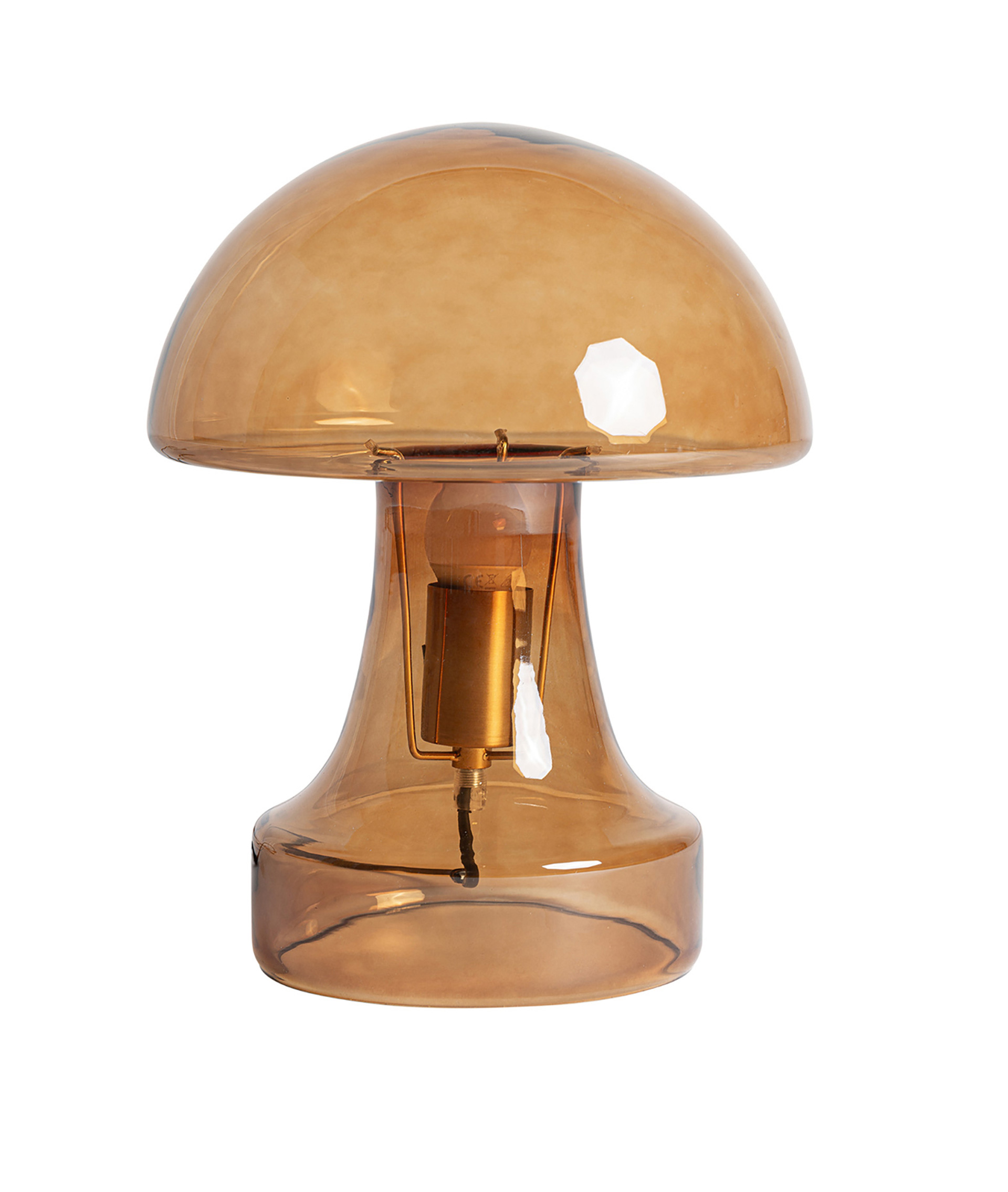 Lámpara de sobremesa Hasselt de estilo contemporáneo, fabricado en vidrio en color ambar con acabado traslúcido, combinado con acero en color oro. Producto desmontable.