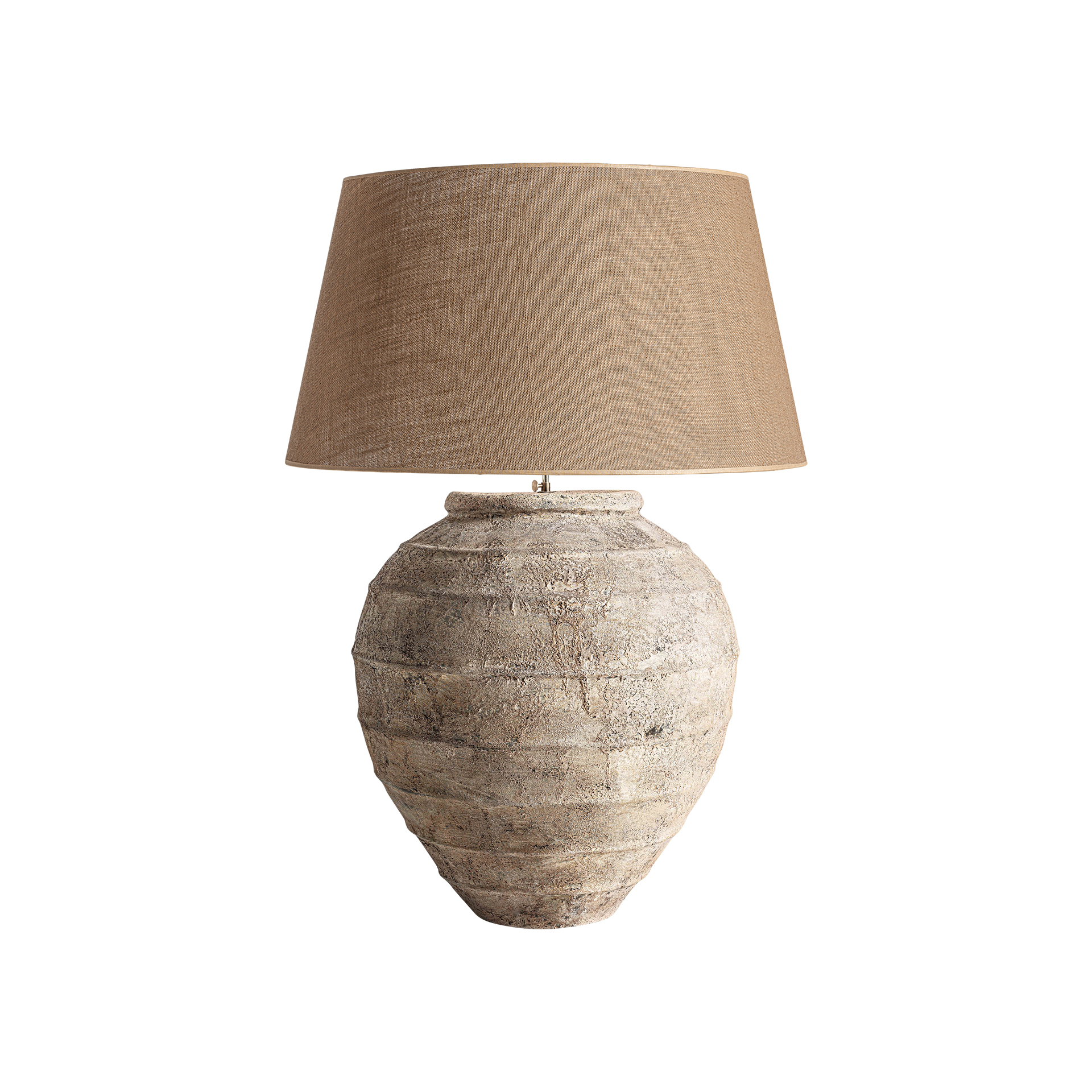 Lámpara de sobremesa Kanlef de estilo provenzal fabricado en cerámica en color beige con acabado envejecido combinado con yute en color marrón.