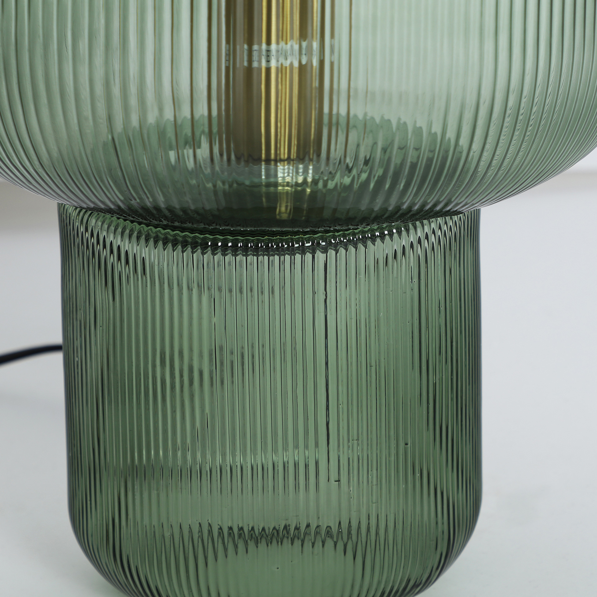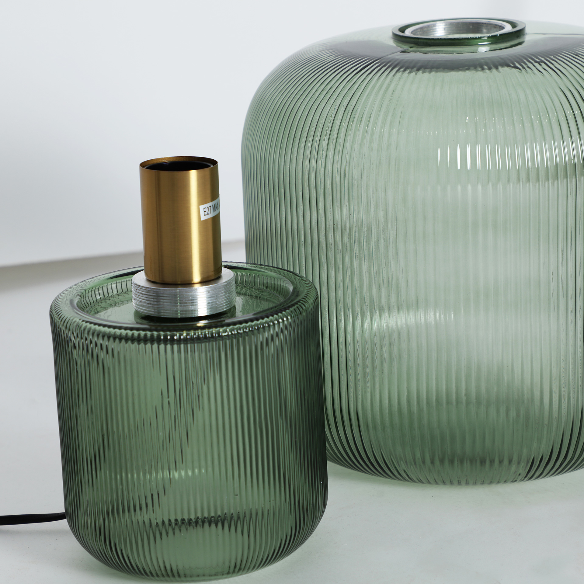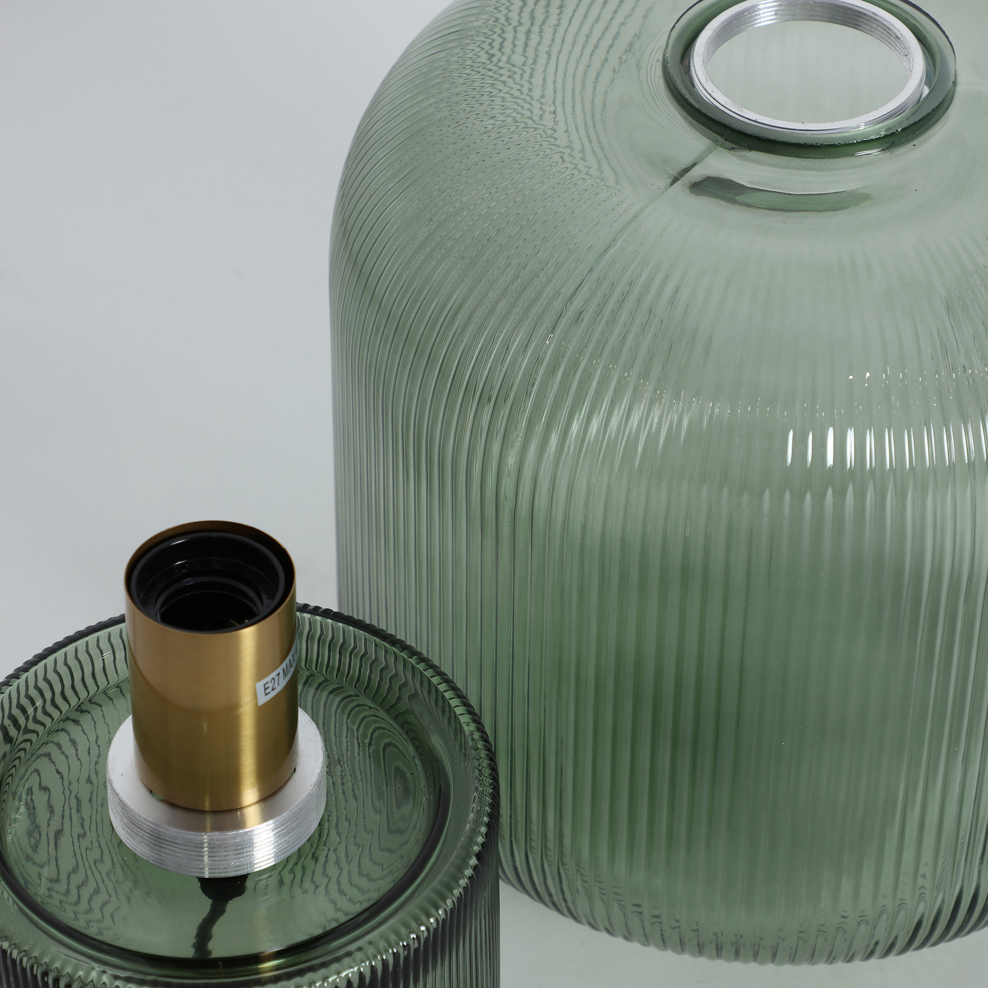 Lámpara de sobremesa Sira de estilo art deco, fabricado en cristal en color verde con acabado estriado, combinado con hierro en color oro.