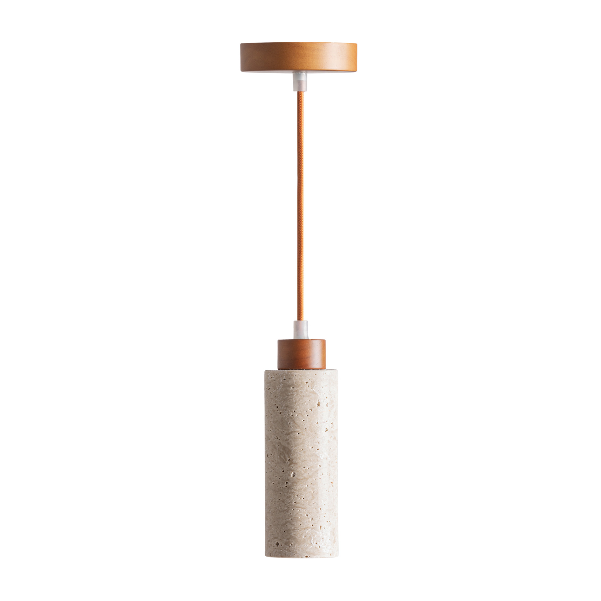 Lámpara de colgar Kaple de estilo contemporáneo fabricado en travertino en color beige combinado con madera en color marrón.