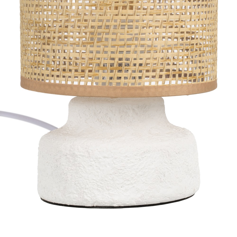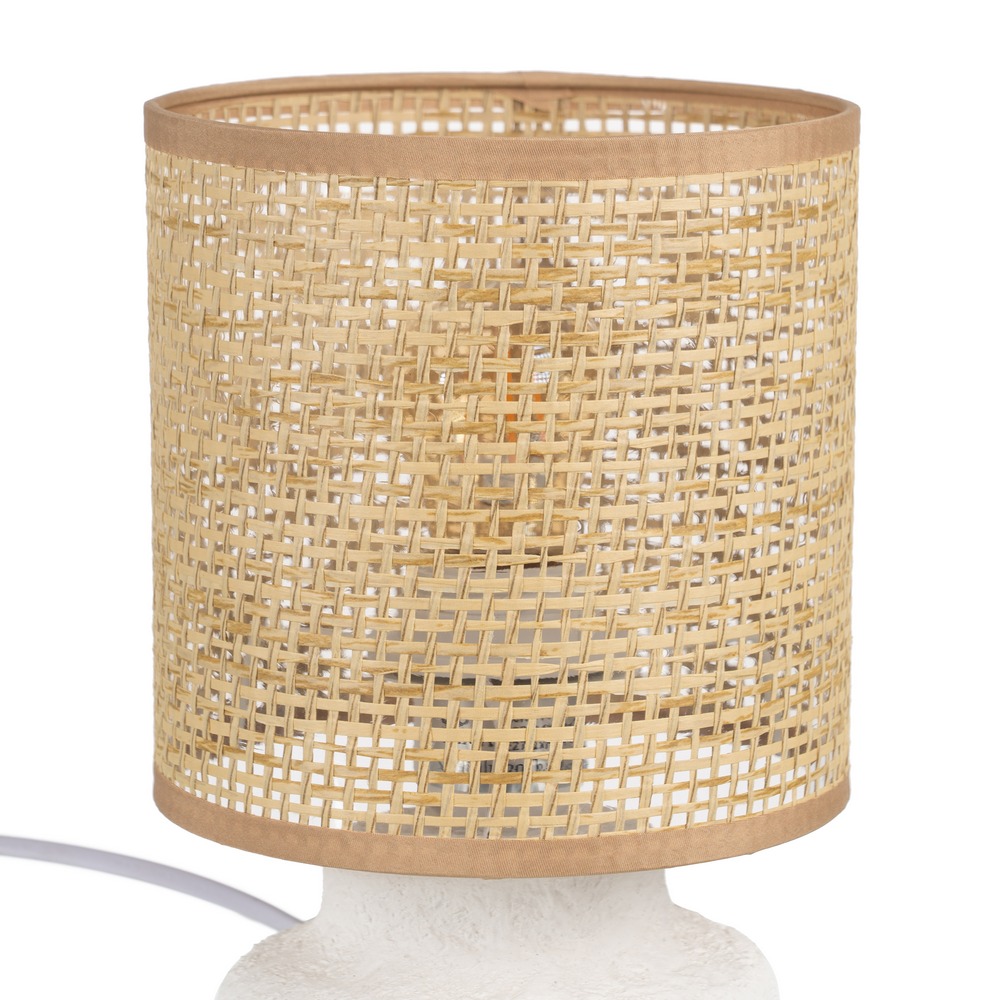 LÁMPARA MESA CERÁMICA ILUMINACIÓN 15 X 15 X 23,50 CM Base de cerámica, medidas 12,5×12,5x8cm. Pantalla de fibra de papel y PVC, medidas 15x15x15cm. Voltios: 220-240V. Casquillo: E27. Bombilla: 1*40W (no incluida). Longitud cable: 135cm.