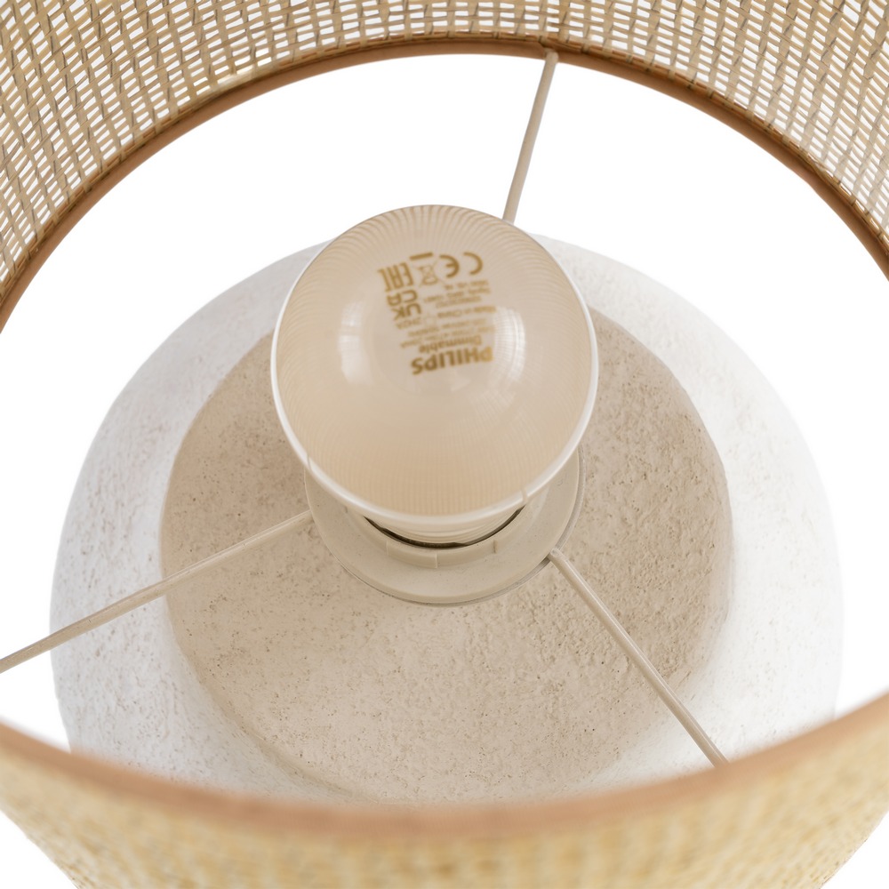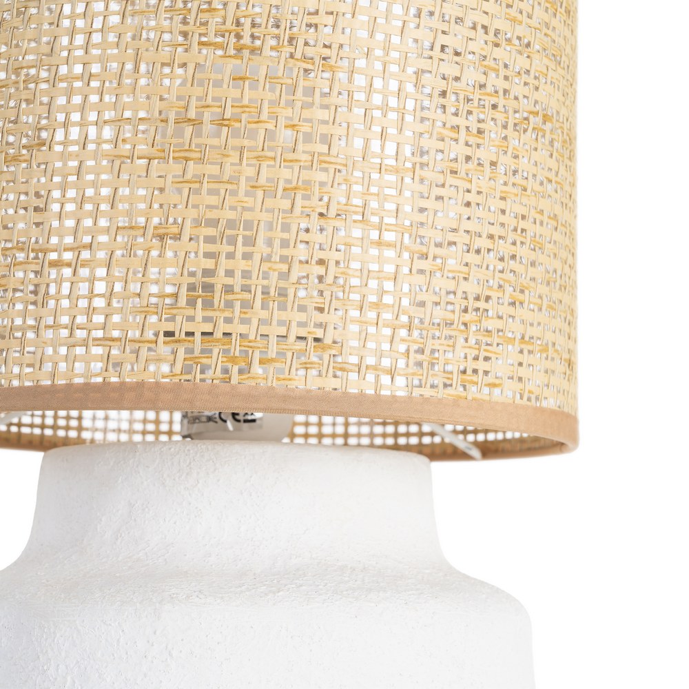 LÁMPARA MESA CERÁMICA ILUMINACIÓN 23 X 23 X 39,50 CM Base de cerámica, medidas 20x20x12cm. Pantalla de fibra de papel y PVC, medidas 23x23x26cm. Voltios: 220-240V. Casquillo: E27. Bombilla: 1*40W (no incluida). Longitud cable: 145cm.
