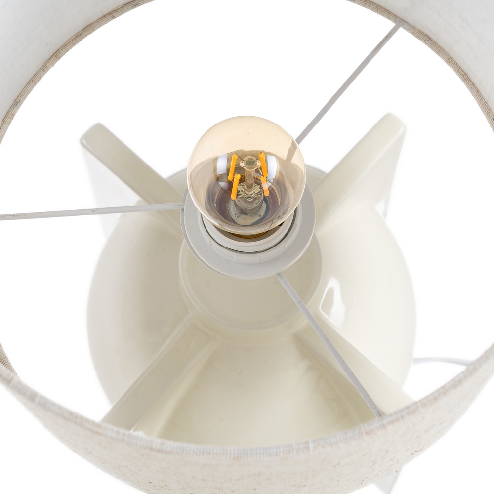 LÁMPARA MESA CERÁMICA ILUMINACIÓN 25 X 25 X 39 CM Base de cerámica, medidas 23x23x27cm. Pantalla de tejido y PVC, medidas 25x25x18cm. Voltios: 220-240V. Casquillo: E27. Bombilla: 1*60W máx (no incluida). Longitud cable: 130cm.