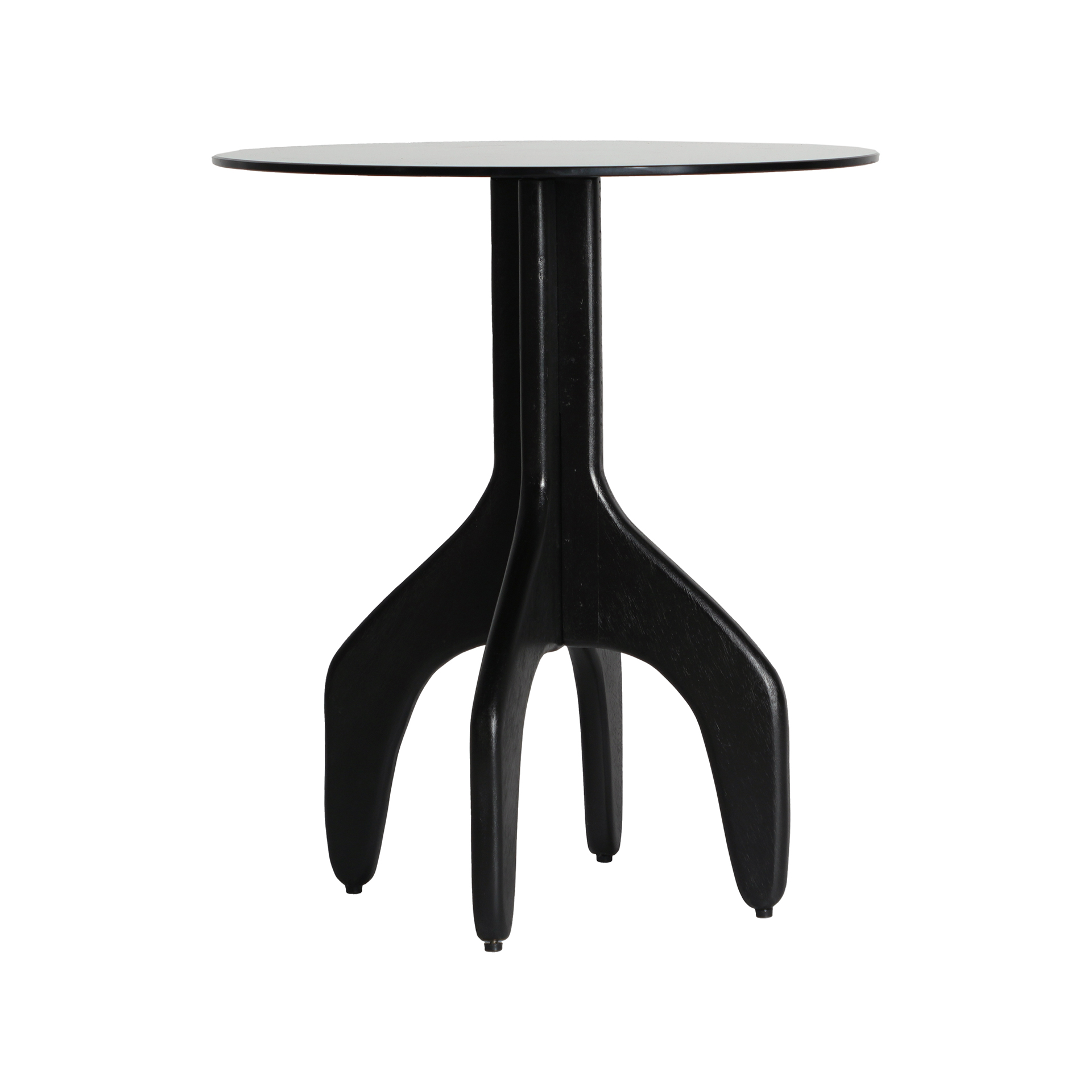 Mesa auxiliar redonda bickerton de estilo contemporáneo, fabricado en madera de mango en color negra, combinado con cristal en color negro con acabado templado. Producto desmontable.