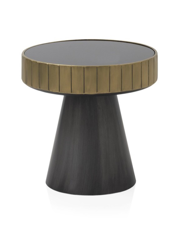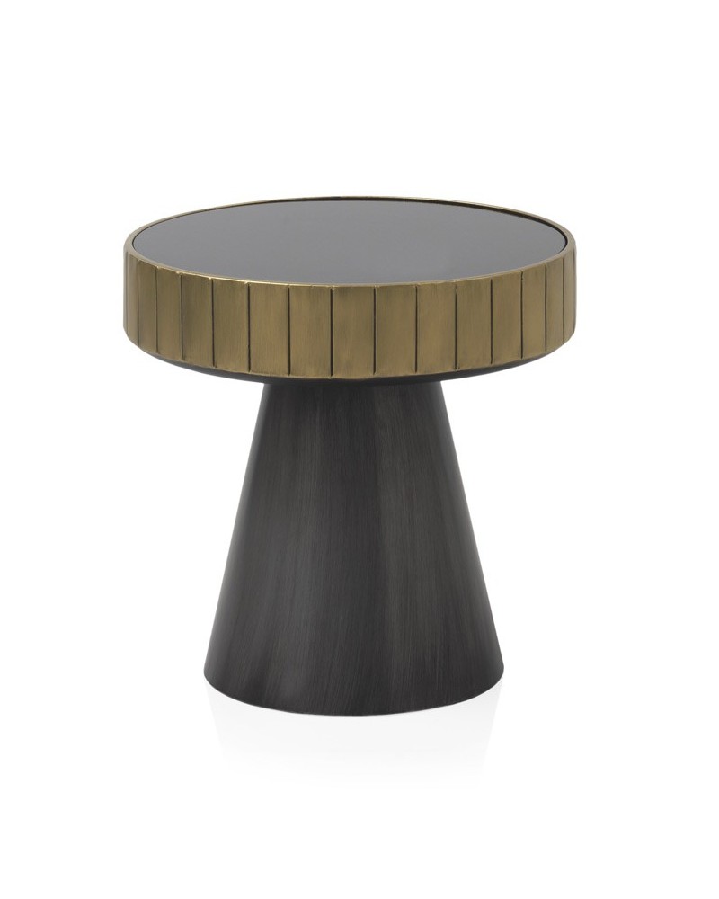 MESA AUXILIAR DE METAL DORADO Y GRIS CON TAPA DE CRISTAL NEGRO