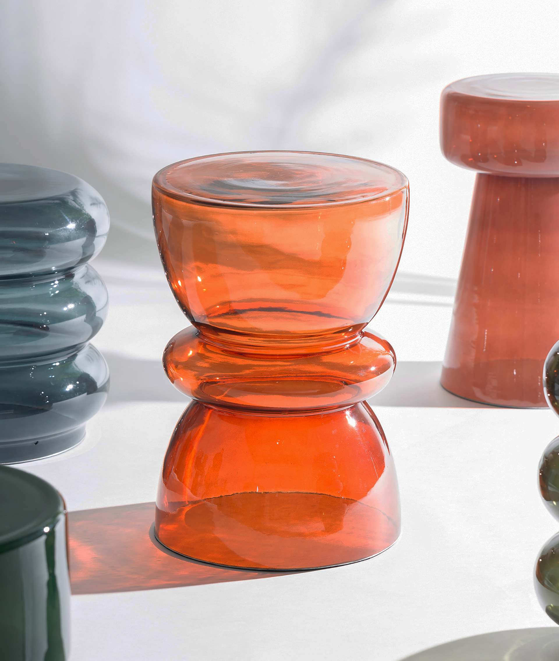Mesa auxiliar Rustrel de estilo contemporáneo, fabricado en vidrio en color naranja con acabado traslúcido.