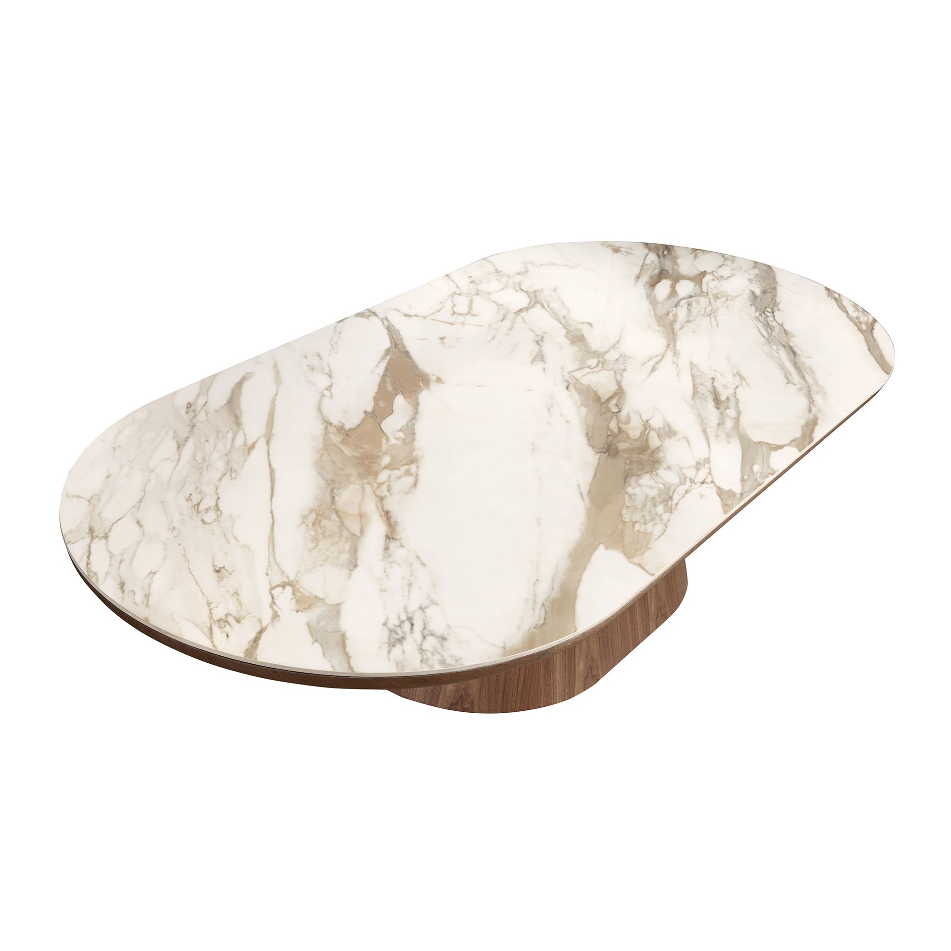 Mesa centro ovalada medio punto mármol porcelánico y nogal | – Material de la tapa: Mármol porcelánico blanco con vetas en tonos tierra en acabado brillo- Material de las patas: Madera chapada en nogal natural de 0,5 mm de espesor