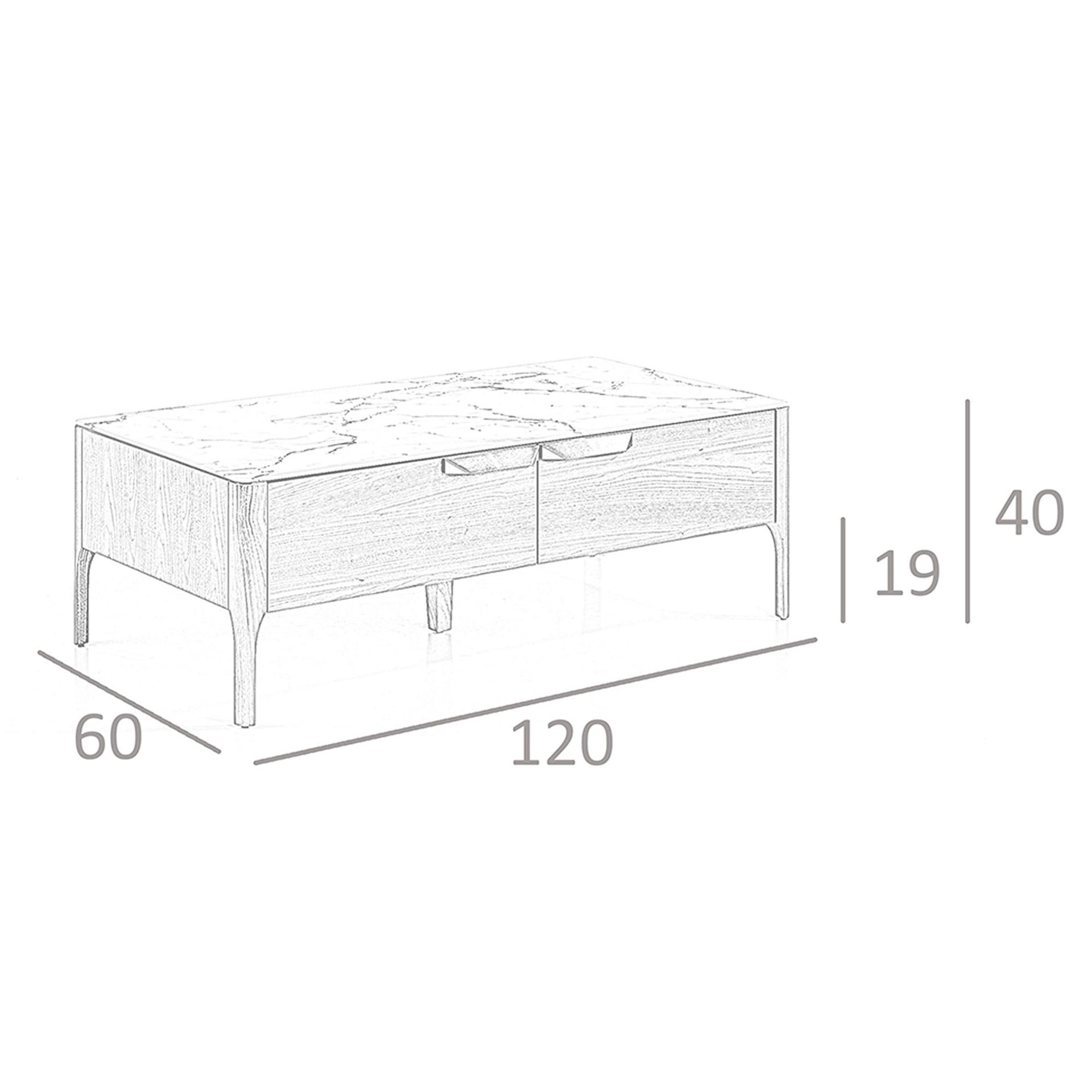 Mesa centro rectangular cristal imitación mármol y nogal | – Material de la tapa: Cristal imitación mármol porcelánico color blanco con vetas grises en acabado brillo- Material de la estructura: Madera chapada en nogal natural de 0,5 mm de espesor- Material de las patas: Madera chapada en nogal natural de 0,5 mm de espesor- Material de los tiradores: acero inoxidable pulido color dorado- Material del interior de los cajones: Madera chapada en nogal natural de 0,5 mm de espesor