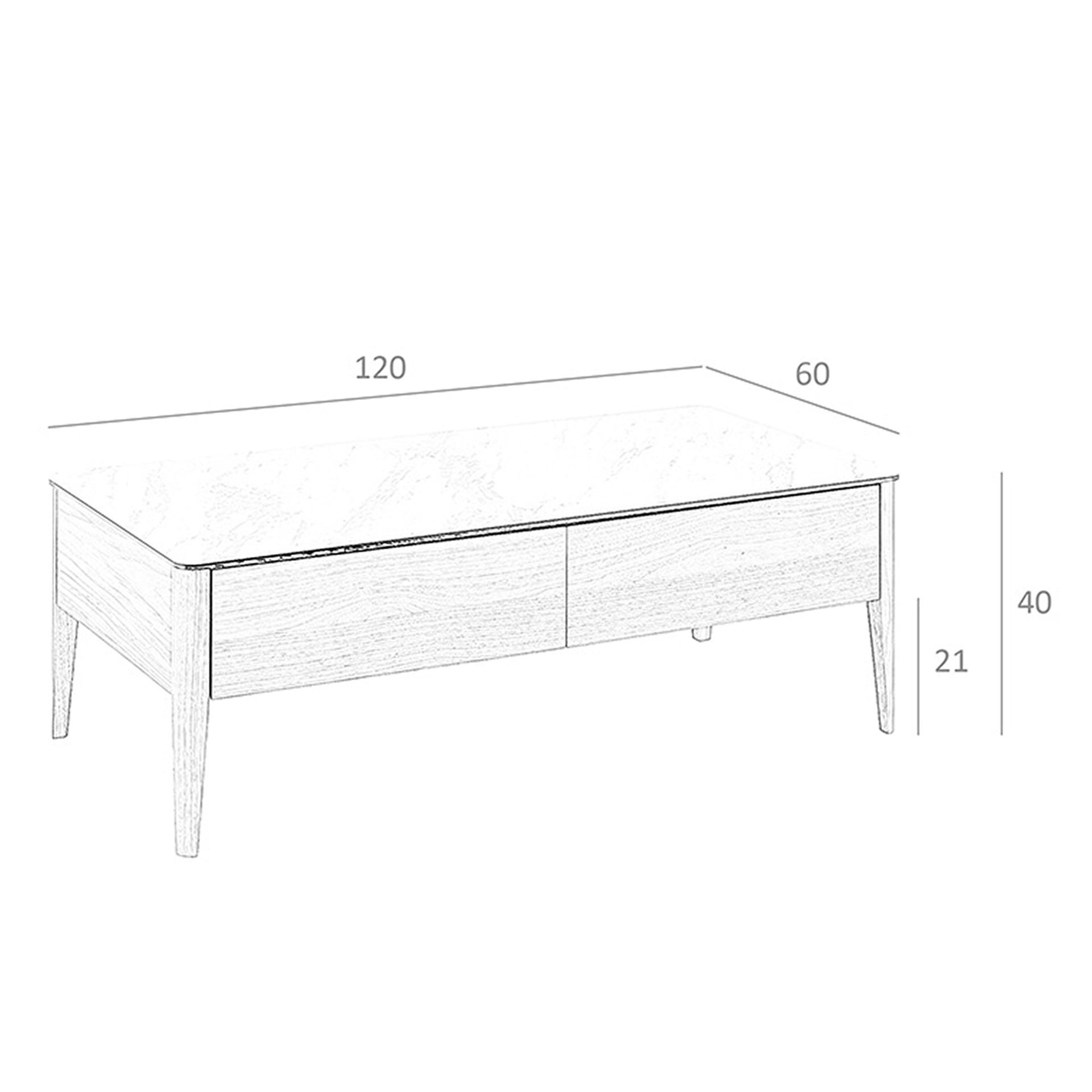 Mesa centro rectangular mármol porcelánico y nogal modelo 2049 Angel Cerdá S.L.Mesa centro rectangular de diseño moderno fabricada en madera chapada en nogal natural y una elegante tapa de mármol porcelánico blanco con vetas en color gris en acabado brillo. Cuenta con un amplio espacio de almacenaje con 2 cajones con sistema de apertura uñero y cierre soft-closing. Medidas del producto: 120 x 60 x 40 cm.- La original tapa de esta mesa auxiliar en mármol porcelánico blanco con mallado en tonalidades grises, aportará amplitud y luminosidad, así como el toque elegante y sofisticado que busca para su salón. – La sencillez y la elegancia de la estructura de madera chapada en nogal natural de 0,5 mm de espesor de esta mesita, es perfecta para crear un ambiente moderno y repleto de estilo. – Su diseño de líneas rectas le permitirá conseguir un ambiente de estilo vanguardista a la vez que sofisticado. – Tanto por su diseño como por su espacio de almacenaje, esta mesa auxiliar es perfecta para crear ambientes amplio y cálidos, a la vez que mantener todo en su sitio.