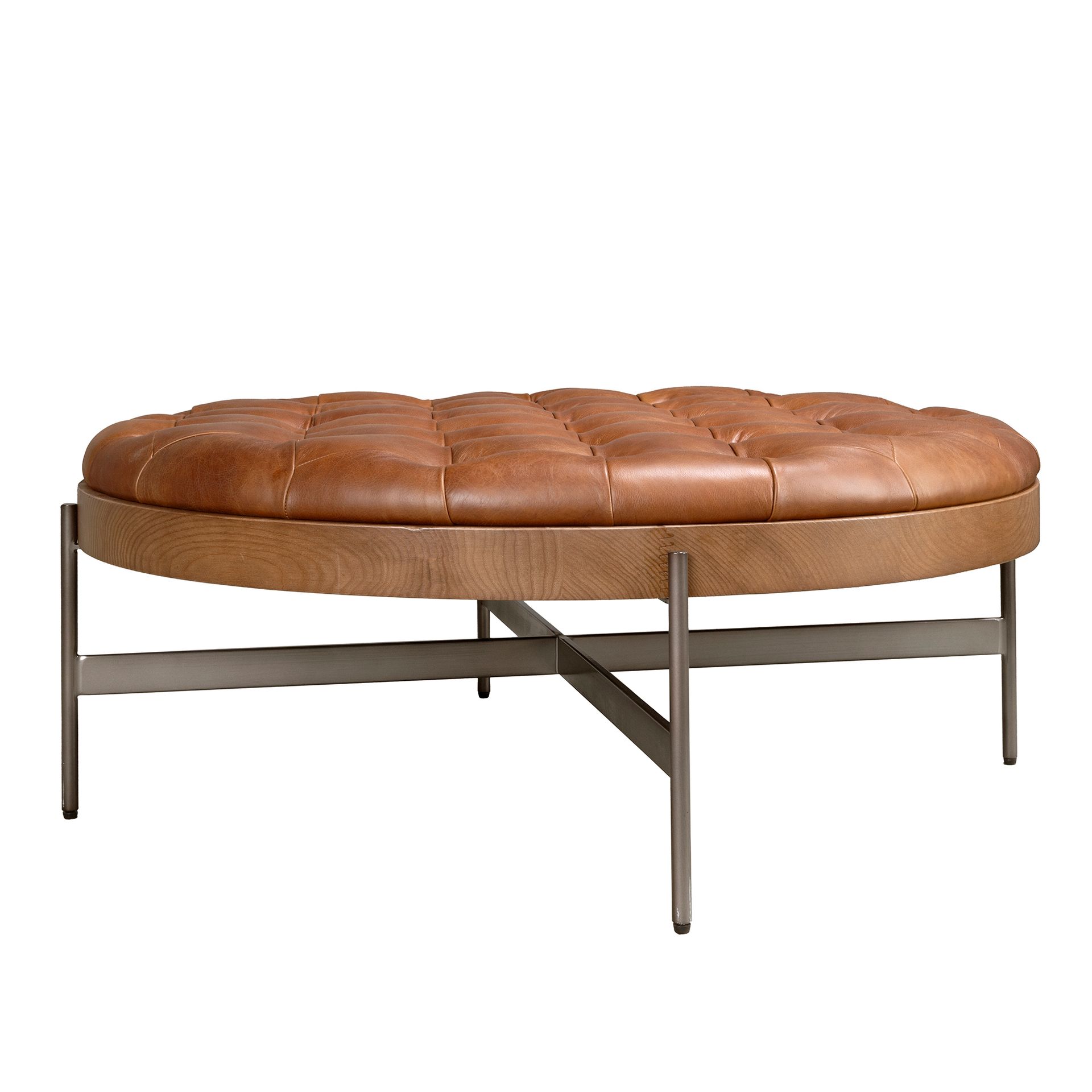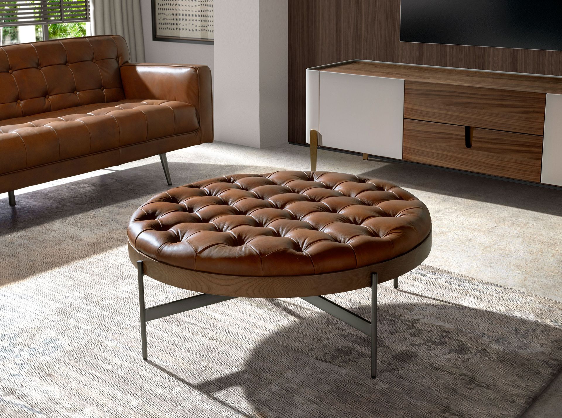 Mesa centro redonda piel color marrón oscuro, nogal y acero oscuro
