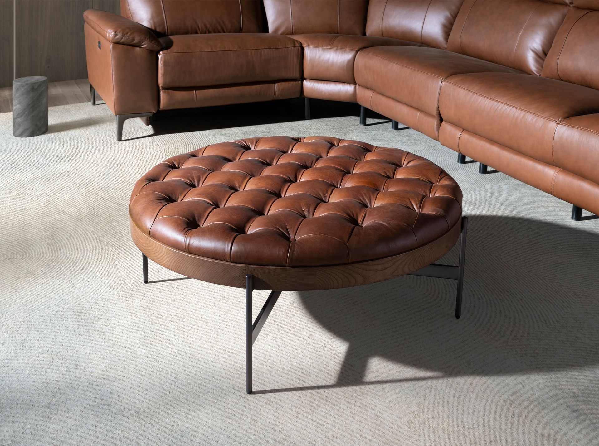 Mesa centro redonda piel color marrón oscuro, nogal y acero oscuro modelo 2147 Angel Cerdá S.L.Mesa centro redonda de diseño moderno fabricada en madera chapada en nogal natural y una elegante tapa de piel de color marrón oscuro. Su estructura de patas de acero inoxidable oscurecido, aporta el toque de modernidad y vanguardia que busca para su hogar.Medidas del producto: Ø100 x 40 cm.- Gracias a su tapa de piel de origen vacuno de 1,25 mm de espesor podrá crear un ambiente cálido, acogedor y repleto de estilo. – El acero de sus patas, así como su diseño lineal, permite que encaje en cualquier espacio de su hogar. – Las líneas redondeadas y curvas de su estructura le permitirá conseguir un ambiente relajado a la vez que exclusivo. – Tanto por sus medidas como por su fabricación con materiales de la mayor calidad, esta mesa es el auxiliar ideal para el día a día, totalmente práctico y funcional. – El tapizado capitoné de su tapa le otorga ese aire distintivo y exclusivo que busca para su salón.