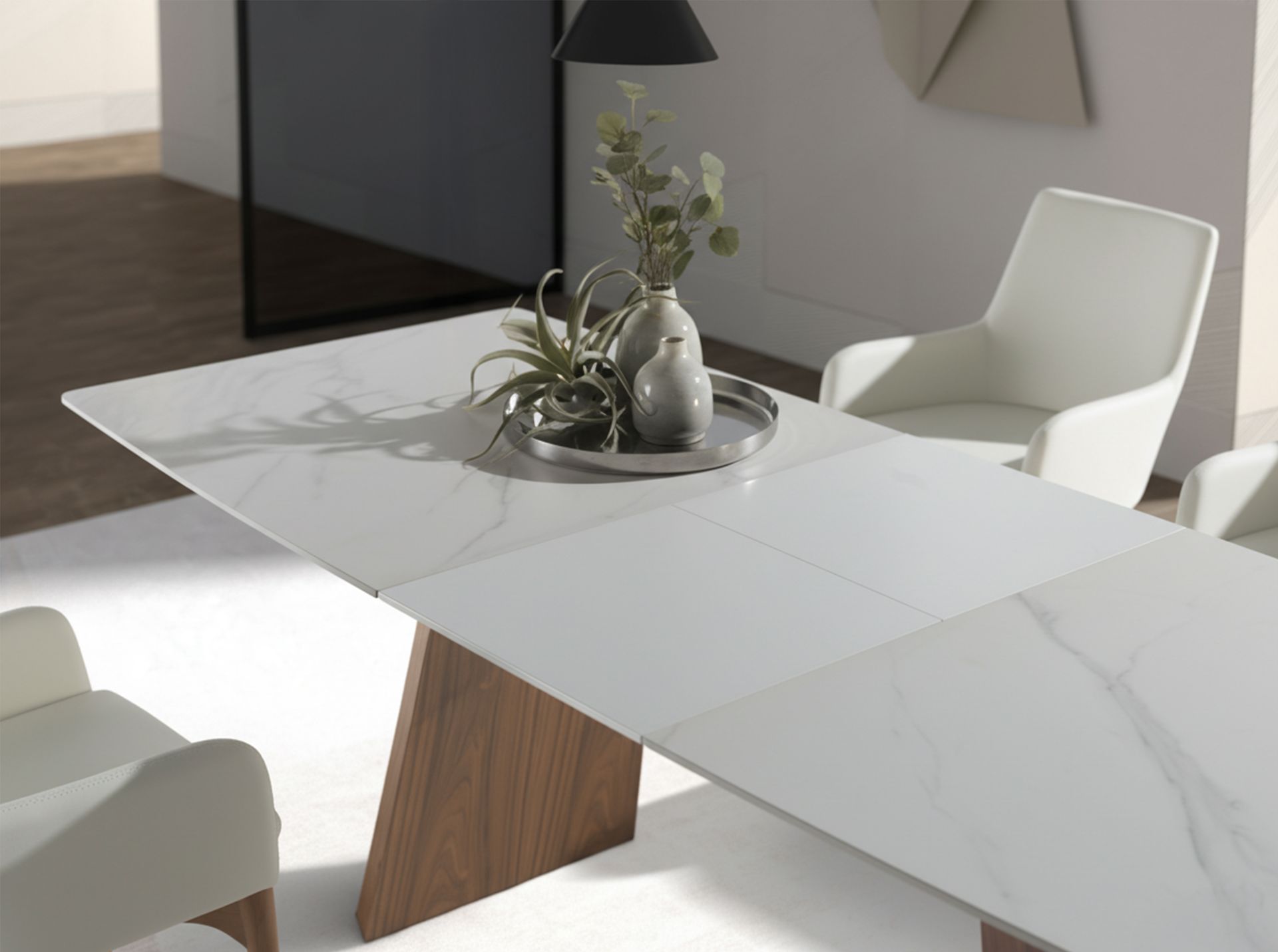 Mesa comedor extensible ovalada barril mármol porcelánico y nogal