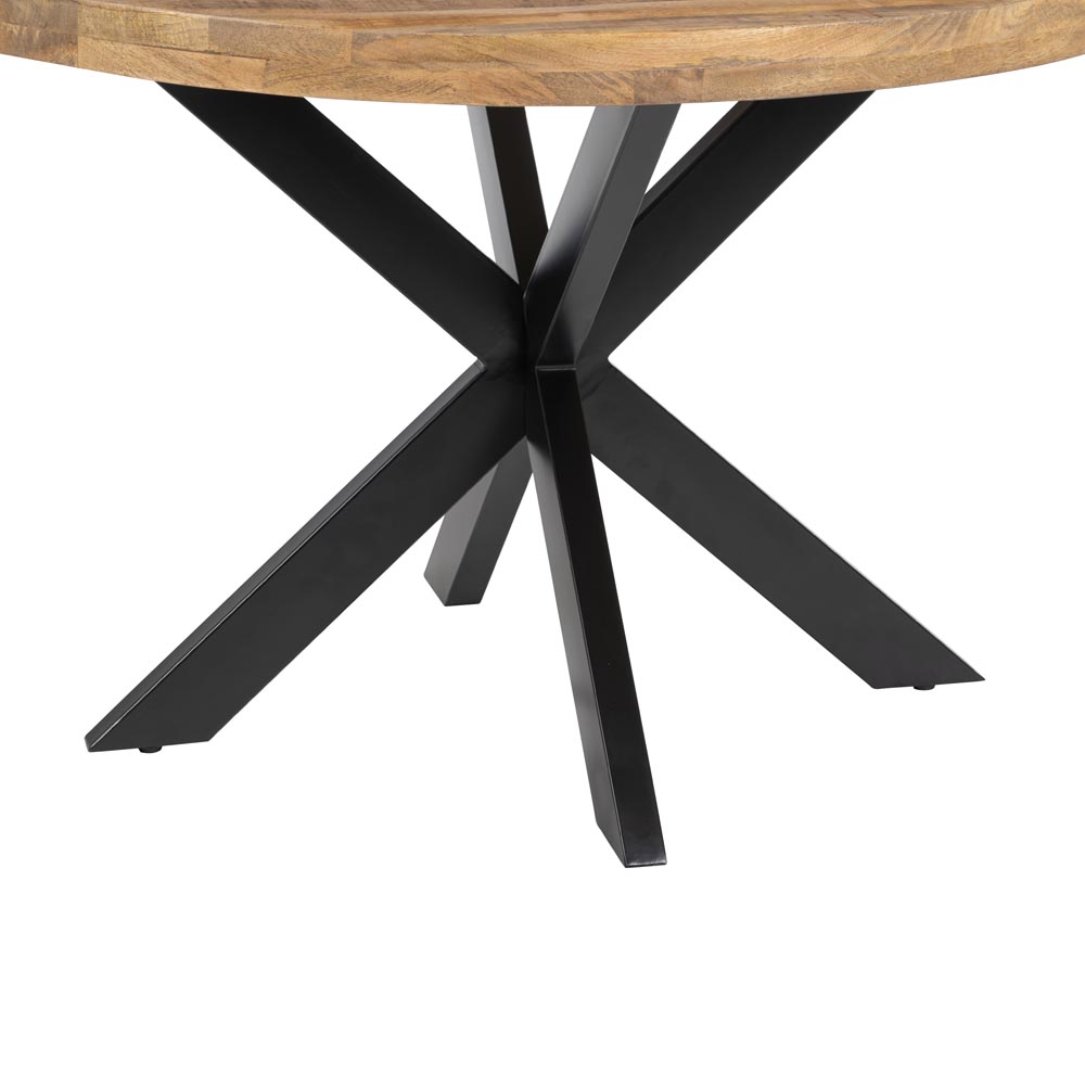 MESA COMEDOR NATURAL-NEGRO MADERA-HIERRO 120 X 120 X 79 CM Material: madera de mango, hierro. Grosor del sobre: 6cm. Patas: 4x8cm. La superficie del sobre puede no ser totalmente lisa debido a su fabricación manual con listones de madera maciza.