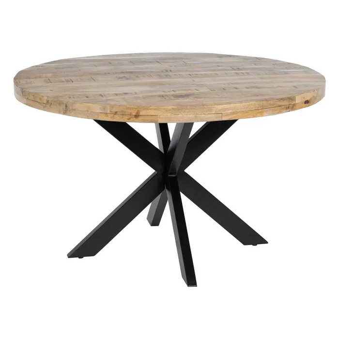MESA COMEDOR NATURAL-NEGRO MADERA-HIERRO 130 X 130 X 77 CM Material: madera de mango, hierro. Grosor del sobre: 6cm. La superficie del sobre puede no ser totalmente lisa debido a su fabricación manual con listones de madera maciza.