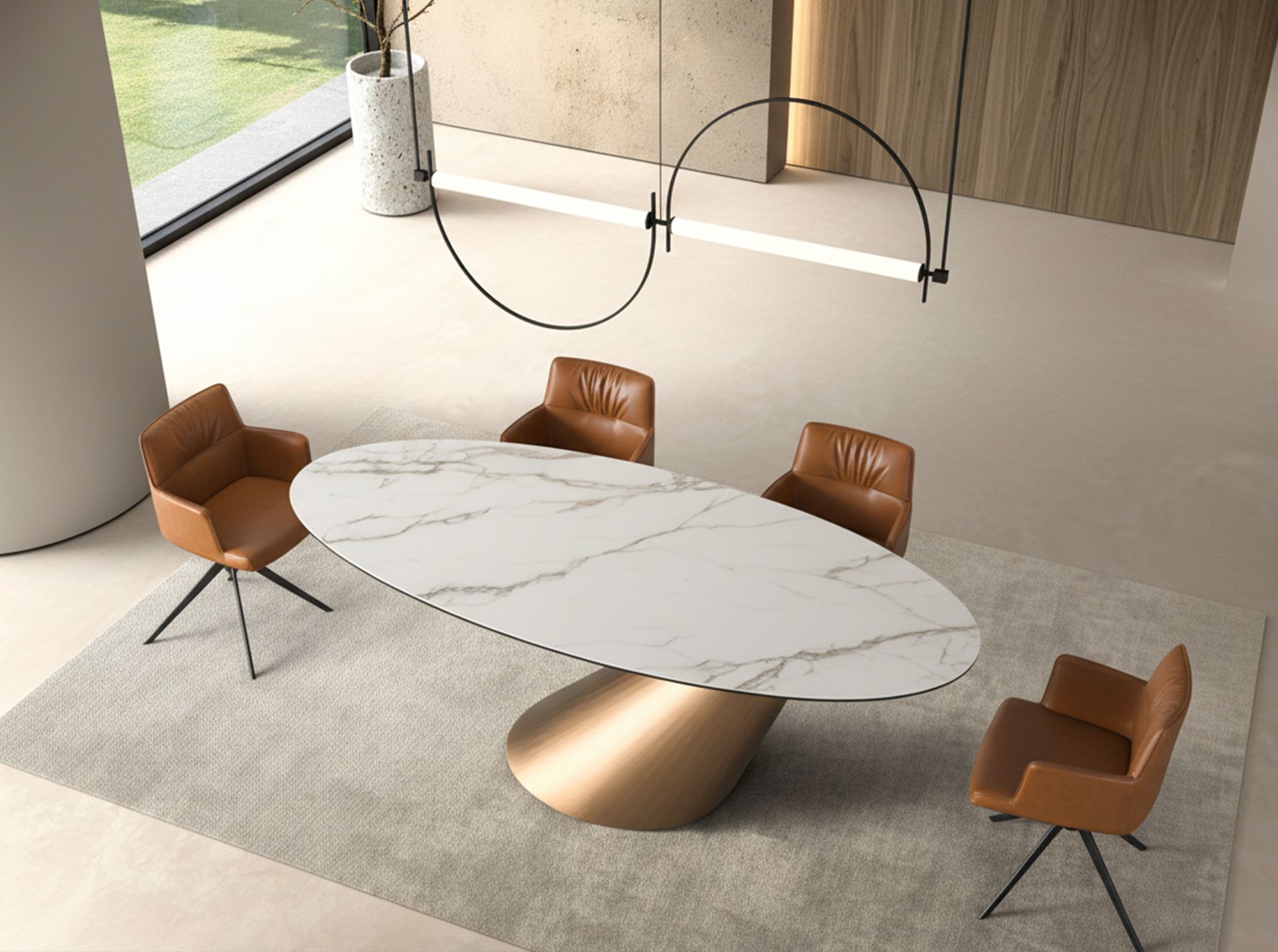 Mesa comedor ovalada mármol porcelánico y acero color bronce