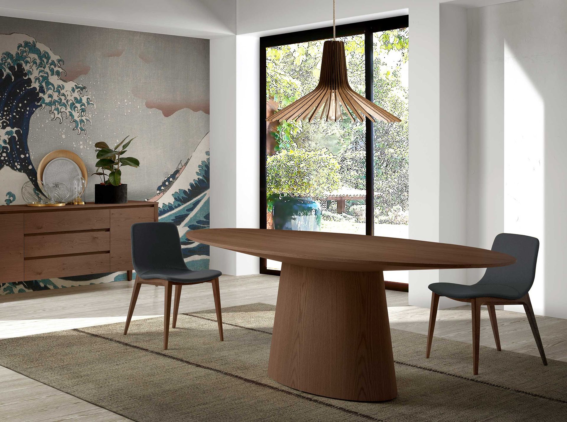 Mesa comedor ovalada nogal modelo 1013 Angel Cerdá S.L.Mesa comedor ovalada de diseño moderno con tapa fija y estructura de madera chapada en nogal natural. Una mesa perfecta para aportar luminosidad y vanguardia a tu cocina, salón o comedor.Medidas del producto: Ø220 x 110 x 76 cm.- Su tapa de madera chapada en nogal natural de 0,5 mm de espesor es resistente y duradera, ofreciendo además, un toque moderno y elegante al ambiente. – La originalidad de su estructura aúna modernidad y robustez, así como la mayor comodidad para sus comensales. – El perfil de la tapa biselado de esta mesa de comedor ofrece la máxima calidad en acabado y comodidad. – Si busca la mesa comedor perfecta para tu hogar, esta es una opción ideal para aunar el toque moderno y de vanguardia que necesitas, con la mayor calidad y funcionalidad. – Apta para un máximo de 8 comensales.
