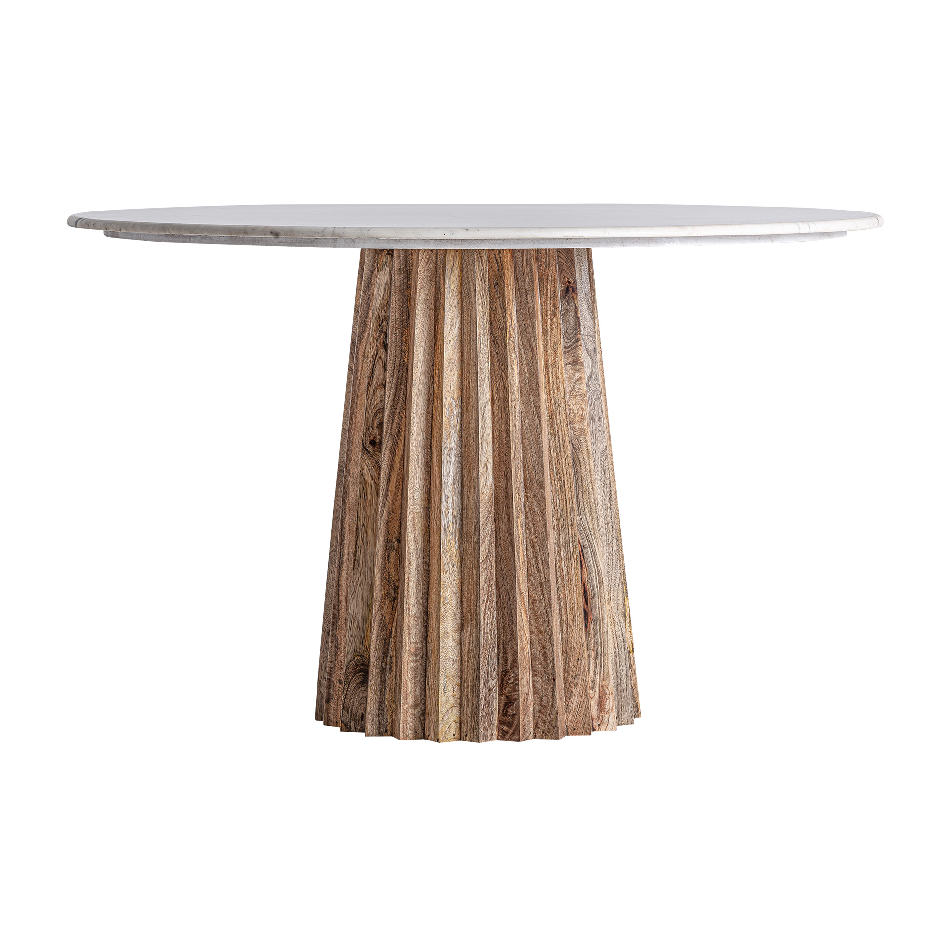 Mesa comedor Plissé wood de estilo contemporáneo fabricado en madera de mango en color marrón claro combinado con mármol en color blanco con acabado veteado. Limpiar rápidamente la superfície del mármol si se mancha para evitar marcas. Producto desmontable.
