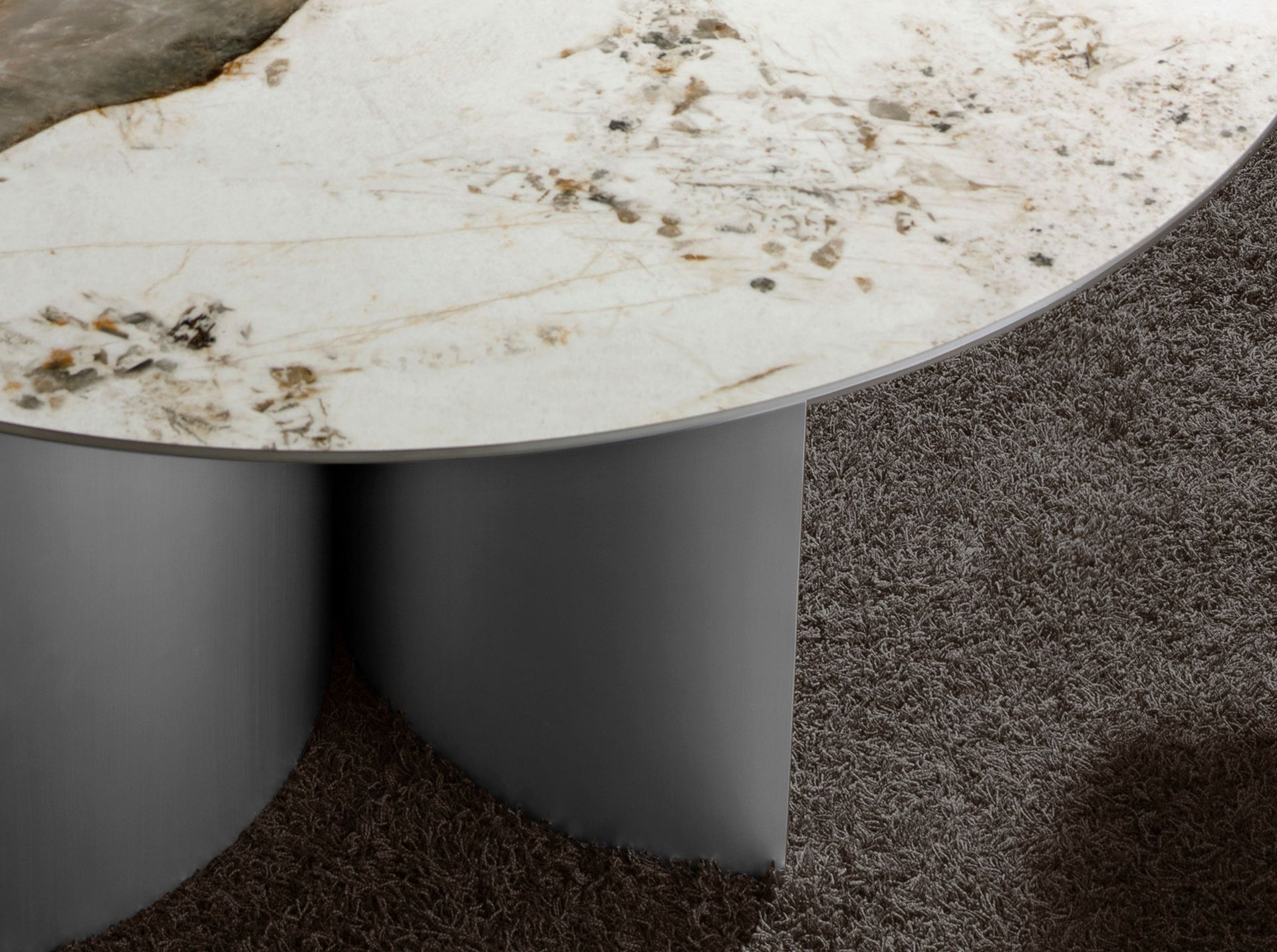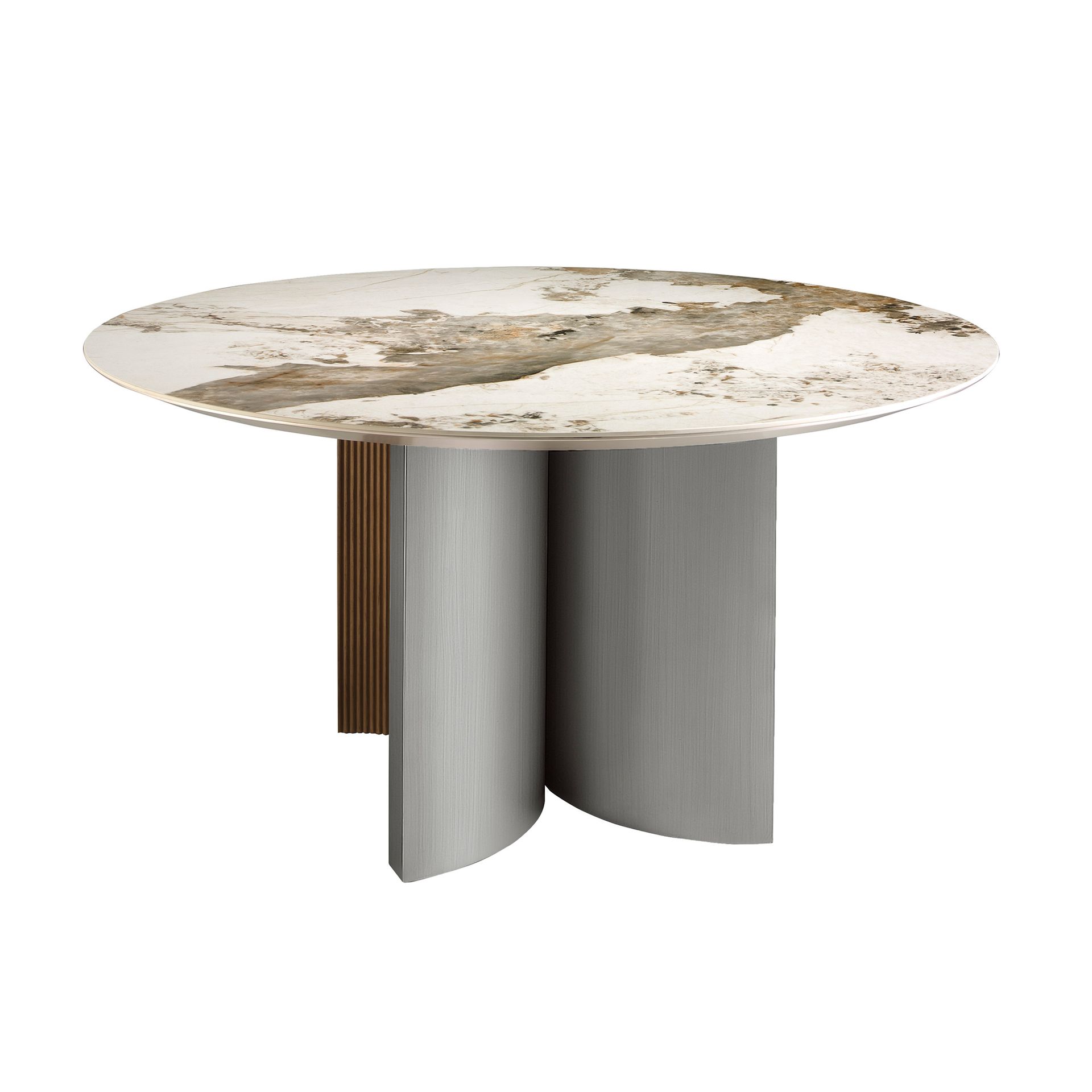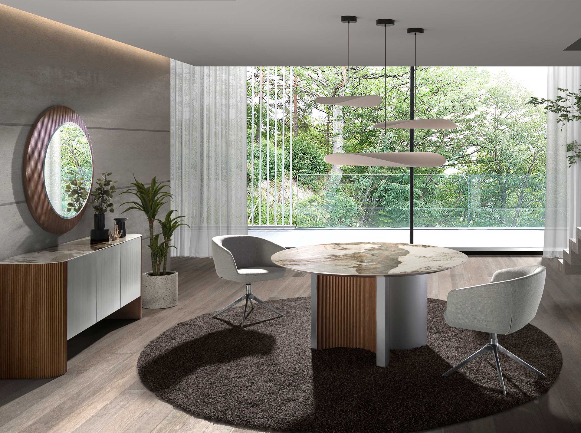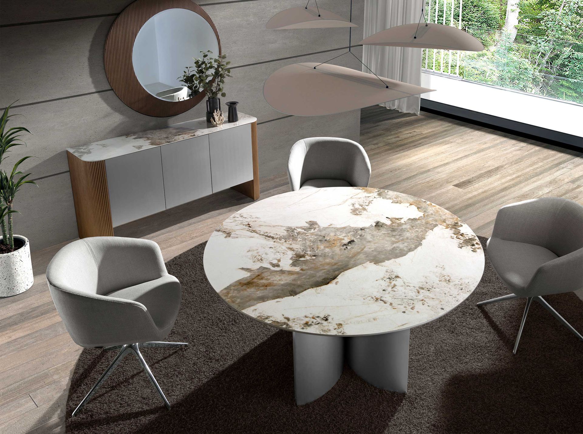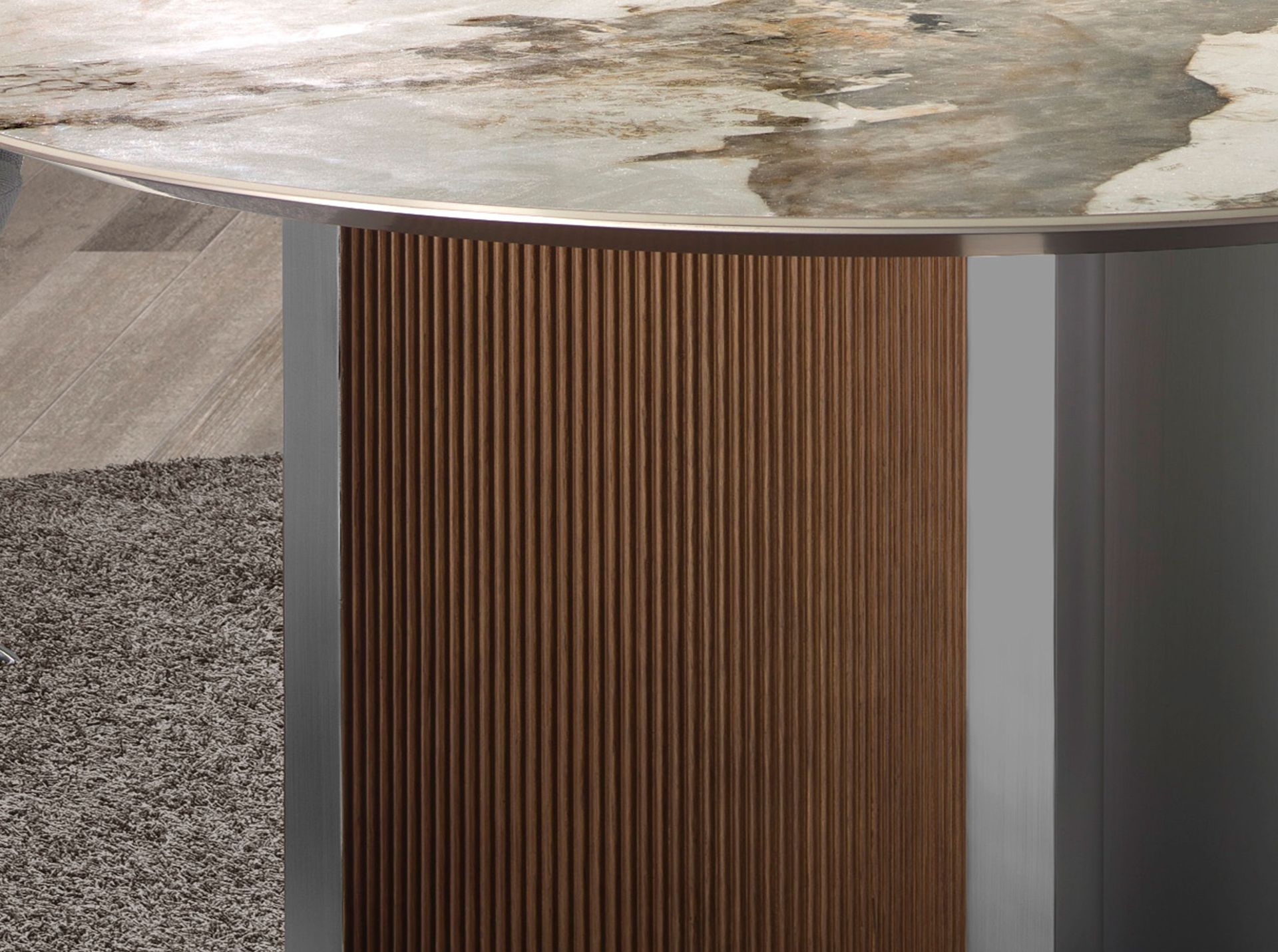 Mesa comedor redonda mármol porcelánico, nogal y madera color plata
