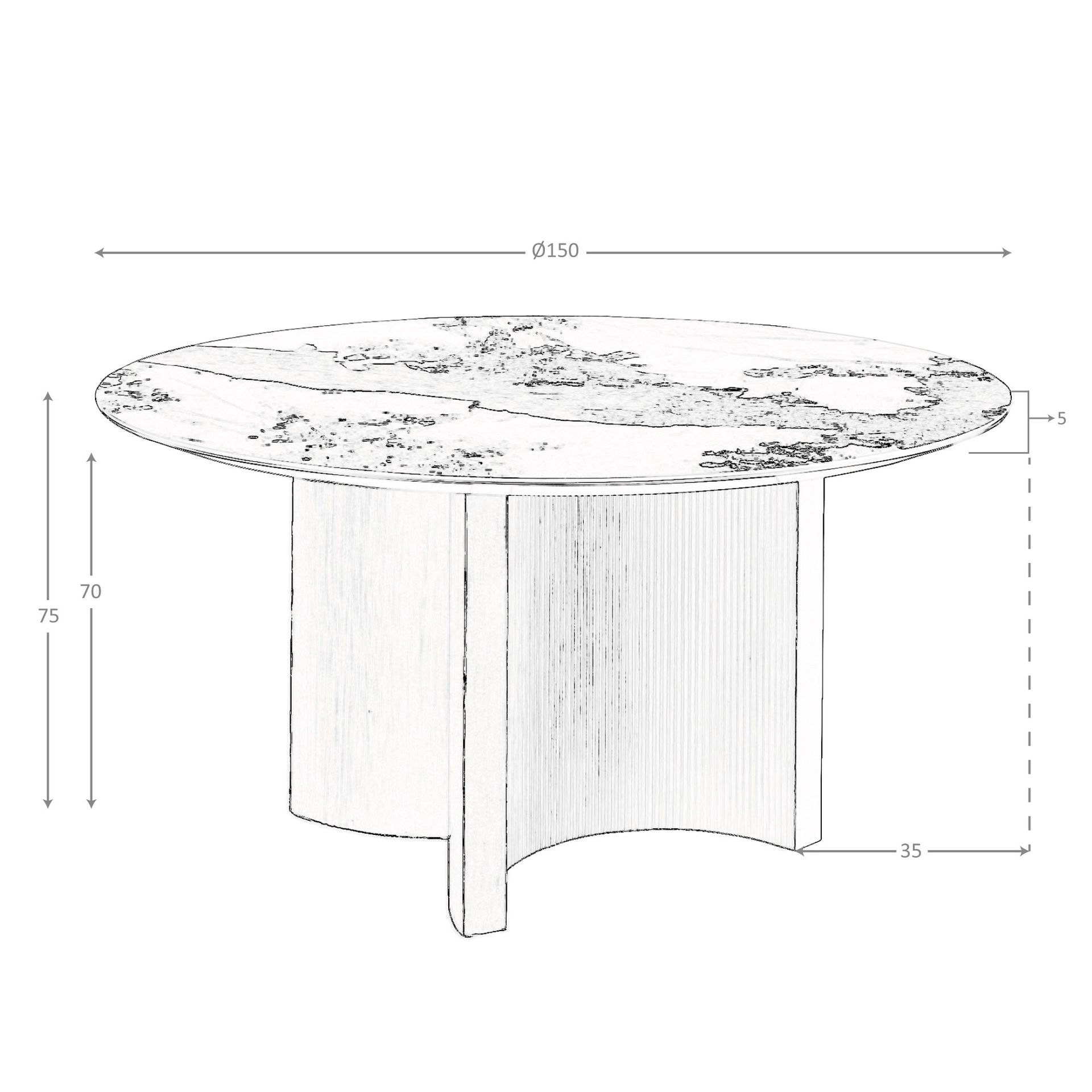 Mesa comedor redonda mármol porcelánico, nogal y madera color plata | – Material de la tapa: Mármol porcelánico blanco con vetas en tonos tierra en acabado brillo- Material de las patas: Madera color nogal y madera MDF lacada color plata