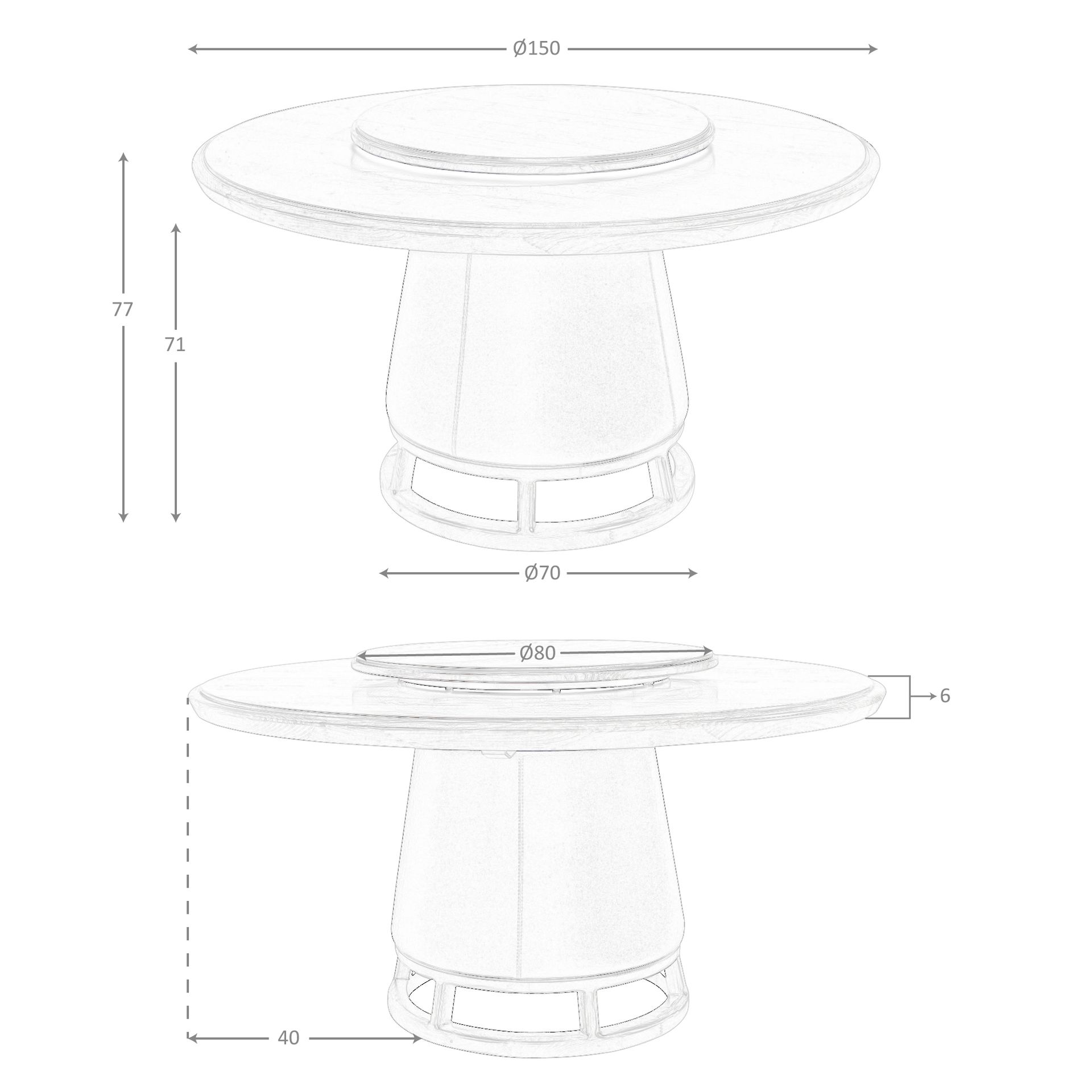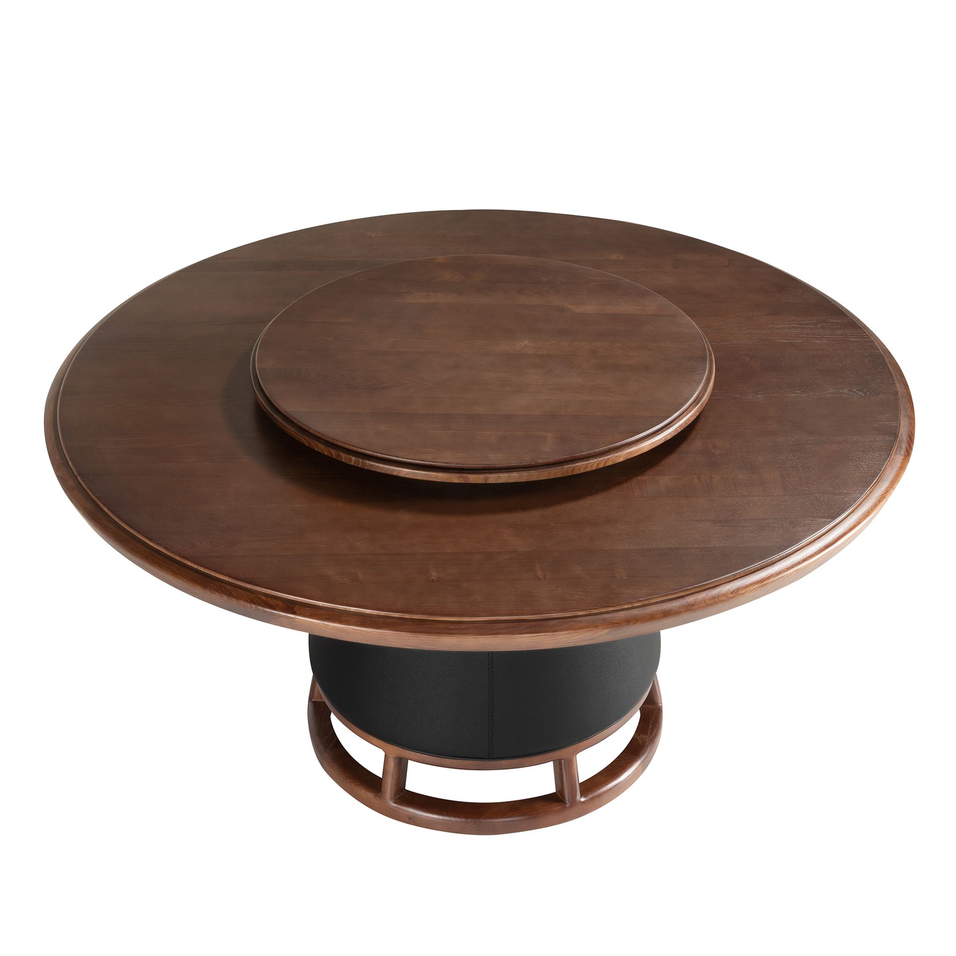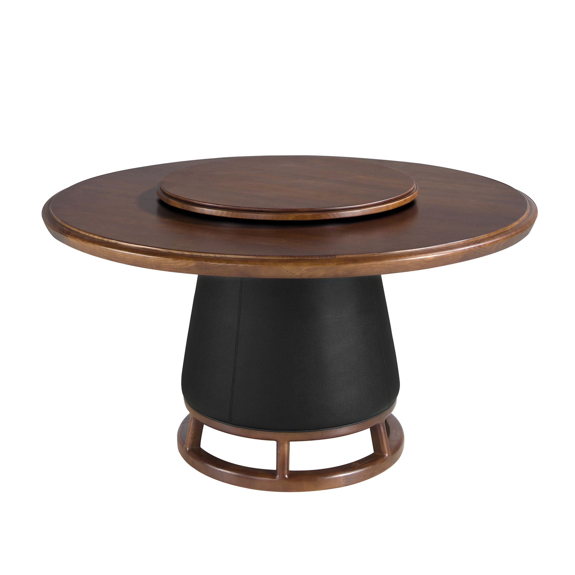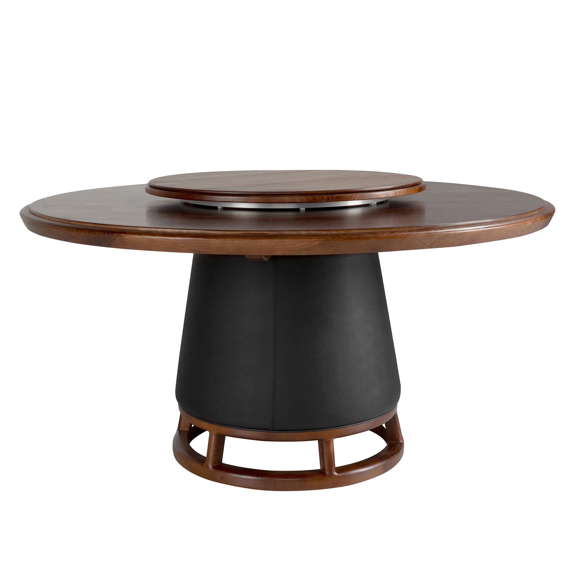 Mesa comedor redonda nogal oscuro y madera tapizada en polipiel | – Material de la tapa: Madera en color nogal oscuro- Material de las patas: Madera tapizada en polipiel- Material de la base: Madera en color nogal oscuro- Material del detalle: Plato giratorio de madera color nogal oscuro