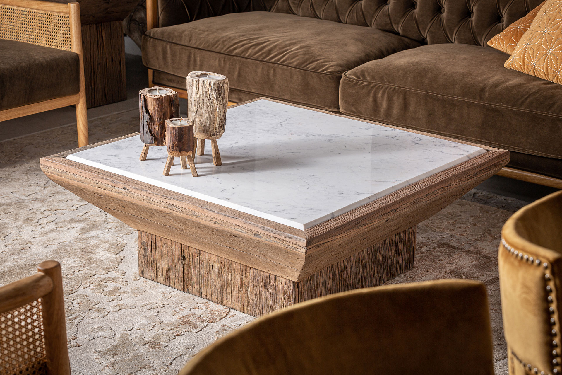 Mesa de centro samsun de estilo étnico fabricado en madera de pino reciclado en color marrón con acabado envejecido combinado con mármol en color blanco. Varias maderas: pino mango teka acacia.