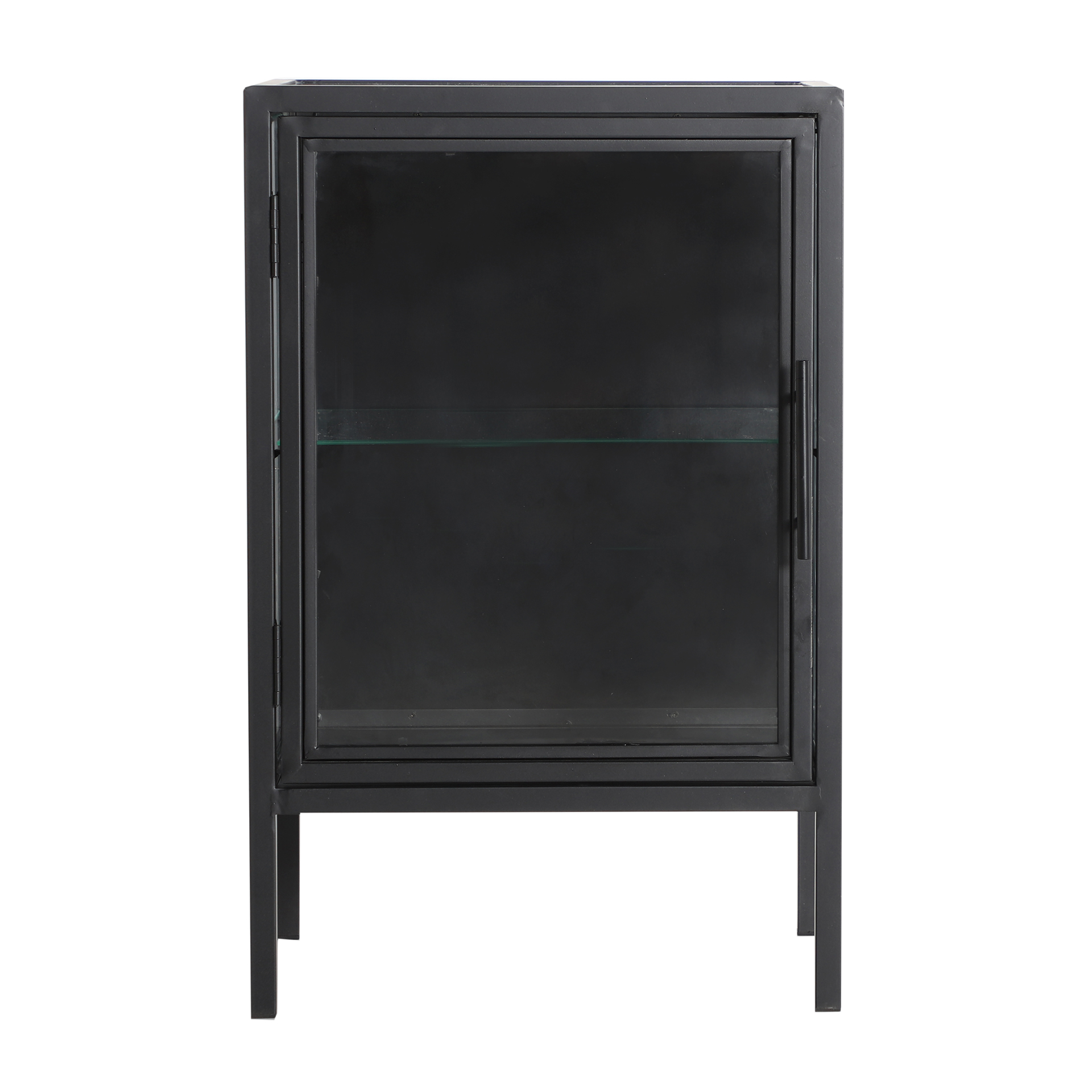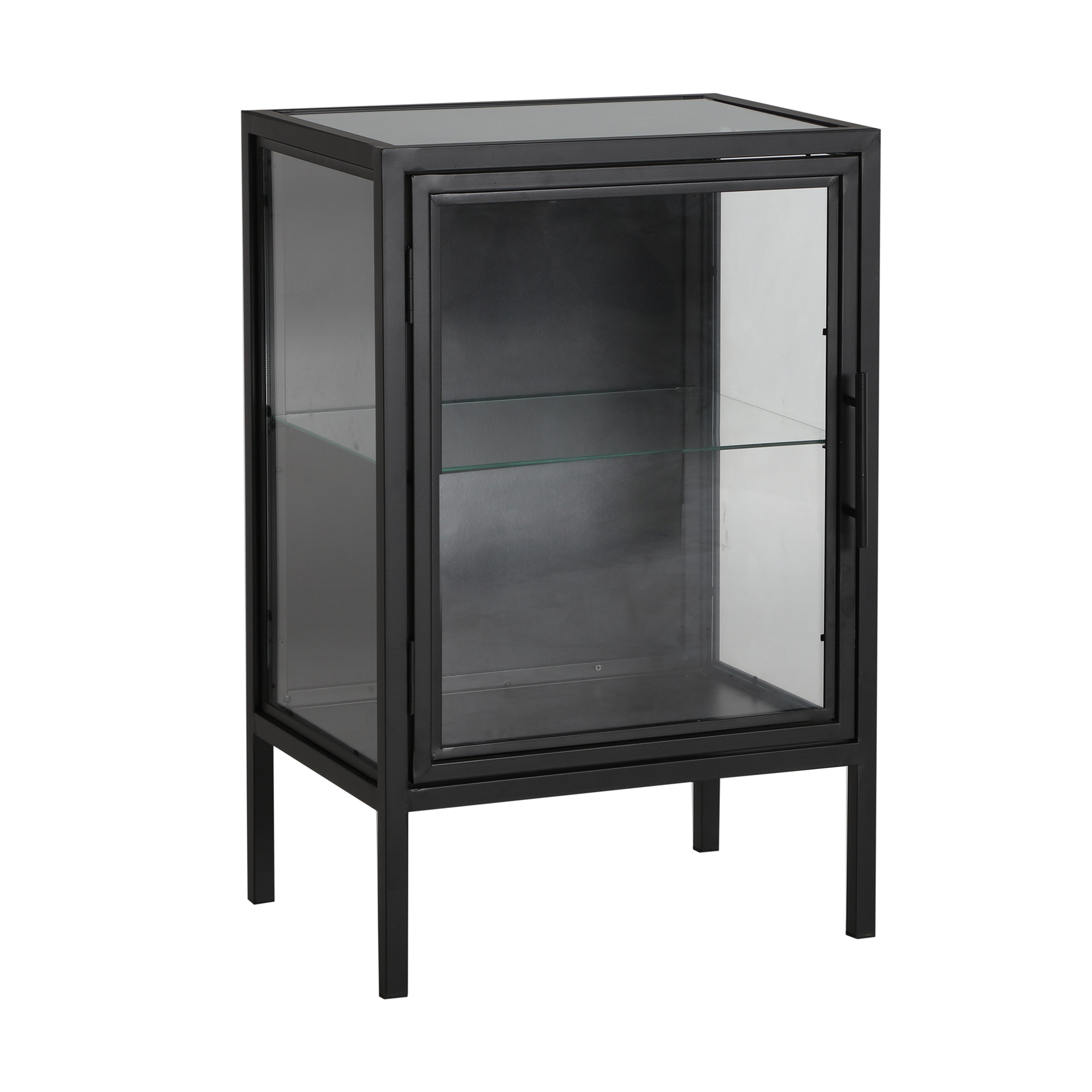 Mesita de noche Kilrea de estilo industrial, fabricado en hierro en color negro, combinado con madera de abeto y cristal con acabado templado.