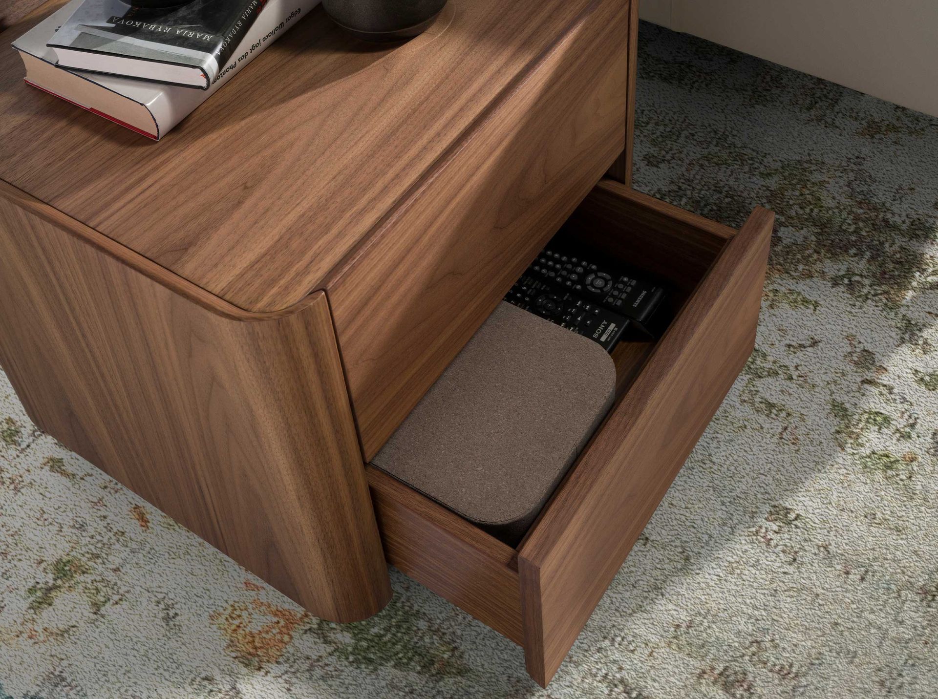 Mesita de noche nogal con iluminación | – Material de la estructura: Madera chapada en nogal natural de 0,5 mm de espesor- Material del acabado: Madera chapada en nogal natural de 0,5 mm de espesor- Material de la base: Base de madera chapada en color nogal- Material del interior de los cajones: Madera chapada en nogal natural de 0,5 mm de espesor